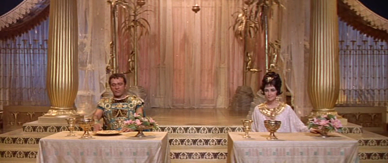 그날밤 시저(리처드 버튼 분)에게 선물이라면서 양탄자가 운반되어 온다. 부하를 물리치고 양탄자를 풀어보니, 그 안에는 클레오파트라(엘리자베스 테일러 분)가 들어있었다. 클레오파트라는 시저에게 다가와 자신을 왕으로 만들어달라고 한다. 그녀의 대담함과 아름다움에 시저는 그녀의 포로가 되어버린다. 시저와 클레오파트라 모두 이미 결혼한 몸이었지만, 둘은 곧 애인 관계가 된다. 클레오파트라의 권력이 점점 강해지자 위기를 느낀 프로레마이어스는 시저에게 대항하지만, 변변히 싸우지도 못하고 패하여 측근들과 함께 성에서 추방된다.