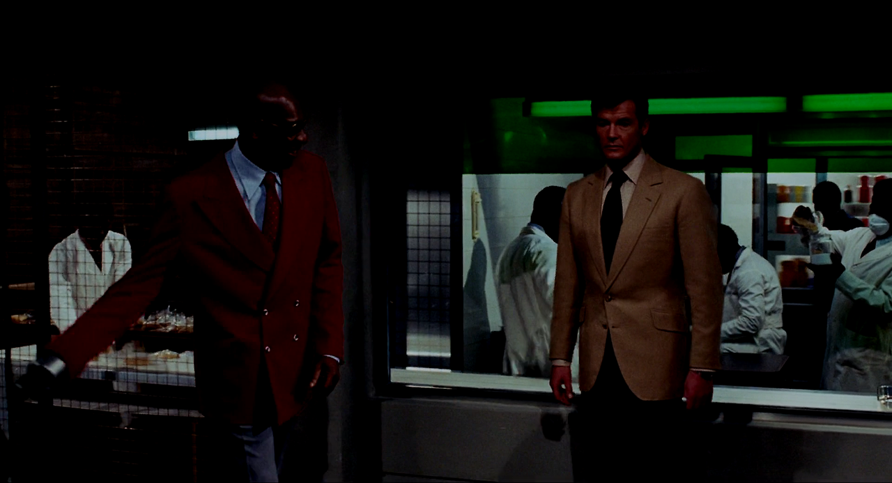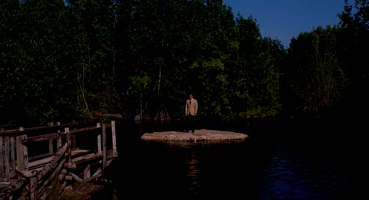 제임스 본드는 의수를 한 남자에게 끌려 깊은 산속에 있는 연구소로 온다. 그곳에는 수많은 악어들을 사육하고 있었다. 수십 마리의 악어가 우글거리는 연못 가운데 있는 돌 위에 본드를 세워두고는 사라진다. 악어가 사방에서 달려드는 절체절명의 상황에서 본드는 악어의 등을 밟고 달려 무사히 연못을 건너오는 데 성공한다. 그리고 악어를 먹이로 유인하여 연구시설로 들여보낸다.