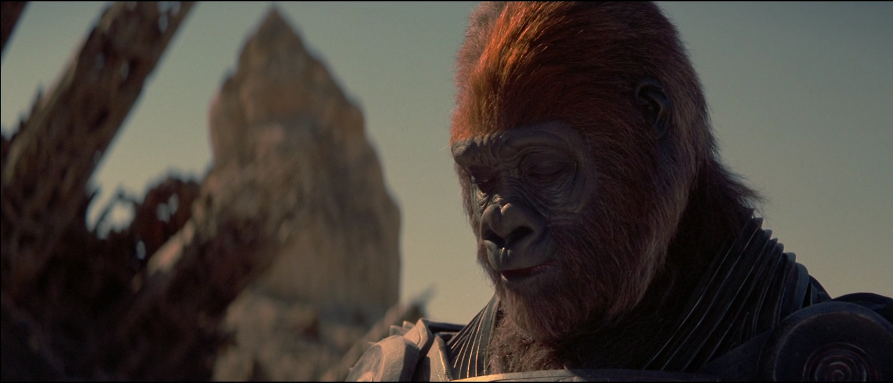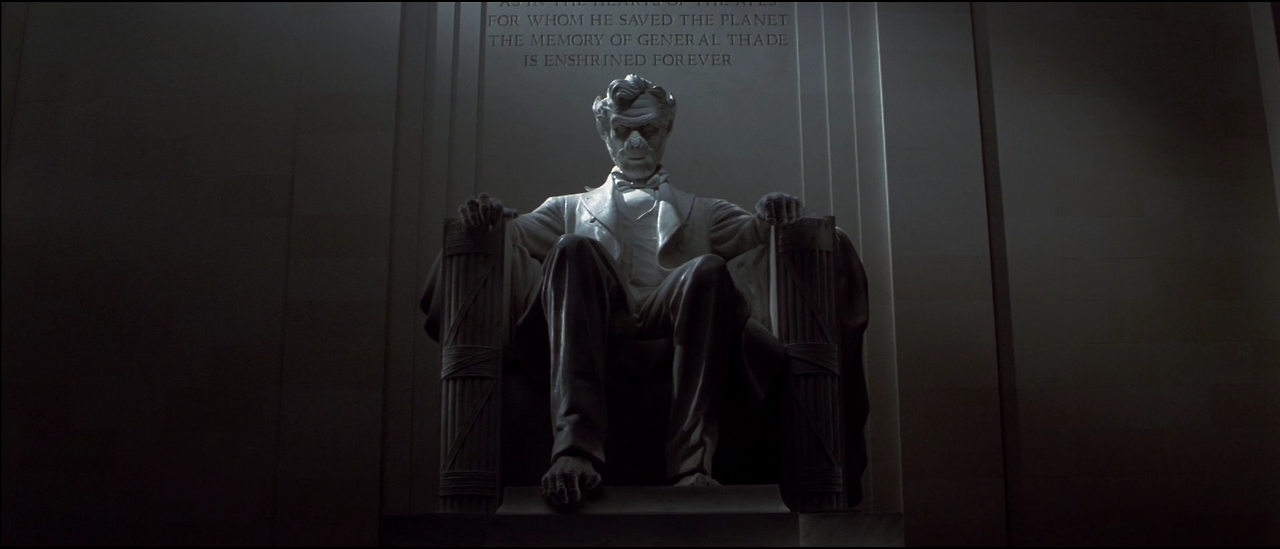 레오는 깜작 놀라 뒤돌아 자신의 등 뒤에 있는 거대한 링컨 동상을 올려본다. 그곳에는 당연히 있어야 할 링컨 의 얼굴은 보이지 않고, 링컨과 같은 복장을 한 하였지만 얼굴은 원숭이 지도자인 시저의 동상이 우뚝 서있었다.