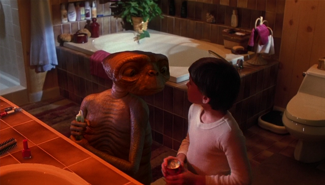 엘리엇과 이티는 대화를 계속 나누면서 감각도 공유하게 된다. 집을 지키고 있던 이티가 냉장고에서 맥주를 꺼내 마시자 학교에서 수업을 받고 있던 엘리엇이 취해버린다. 게다가 이티가 텔레비전에서 존 웨인과 모린 오하라가 키스를 하는 장면을 보고 있자, 학교에서 엘리엇은 좋아하고 있던 여자 아이에게 키스를 한다. 이티는 여러 TV 프로그램을 보면서 영어를 배운다. 이티는 엘리엇과 마이클이 가져온 여러 잡동사니를 가지고 통신기를 만든다.