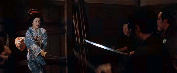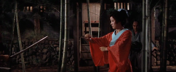 신분을 감추었기 때문에 관소(関所, 검문소)를 통과할 수 없는 오카츠는 근처 숙소에서 사내들에게 미인계를 써서 관소를 통과하려 한다. 그렇지만 출세욕에 사로잡여 타시로의 개가 된 신사브로의 습격을 받아 부상을 입는다. 위기의 순간 오카츠는 오이누 하야토(犬神隼人)란 낭인의 도움으로 목숨을 건진다. 오이누 하야토는 이전에 누마다 번의 검도 사범을 하던 무사였으나, 그 자리를 노리는 이즈모의 음모에 의해 번으로부터 추방된 사내였다. 오이누의 도움으로 타시로를 막다른 골목으로 몰아넣은 오카츠는 악귀라는 소리를 들으면서도 타시로 일파를 모두 죽이고 복수에 성공한다.