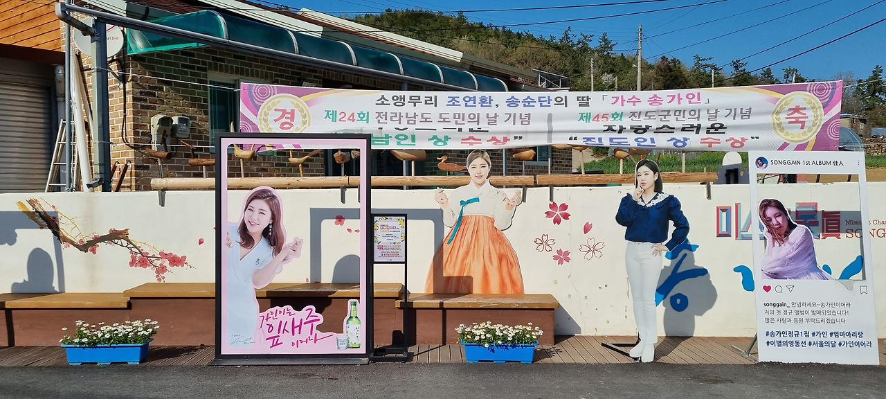 곧 낮은 언덕 위에 가구수가 10여호 남짓되는 작은 동네가 나오는데, 그곳이 송가인 마을이다. 마을 아래 도로변에는 여러대의 관광버스와 승용차가 주차할 수 있는 제법 큰 주차장이 마련되어 있다. 송가인 생가는 마을 초입에 있다. 송가인 생가 담벽에는 송가인의 활동을 담은 여러 장식물이 있고, 집 앞에는 카페가 2개에다가 기념품점까지 있다. 나로서는 도저히 상상도 못할 일이다. 그렇지만 그런 생각을 가진 나도 결국 송가인의 집을 찾았으므로 한편으로는 이런 경향이 이해가 가기도 한다.
