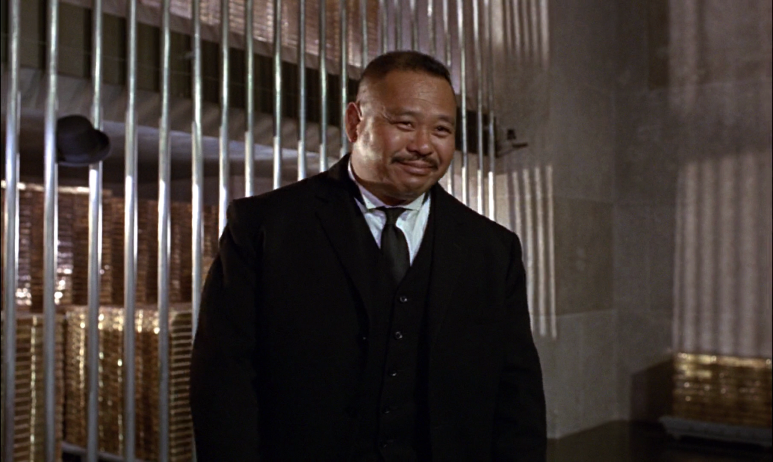 연방은행의 금 보관소는 미군이 삼엄하게 지키고 있다. 골드핑거는 공중에서 수면약을 살포하여 도시 전체를 잠들게 한다. 골드핑거는 부하들을 이끌고 금괴 보관소에 들어가 시간폭탄을 장치한다. 그리고 폭발과 함께 본드도 죽도록 시간폭탄 옆에 본드를 결박하고 그들은 물러난다. 그러나 본드가 누구인가? 그렇게 간단히 죽을 본드는 아니다. 결박을 풀고 시간폭탄을 제거하려 한다. 이 모습을 본 오드잡이 본드에게 덤빈다. 본드와 오드잡 사이에 치열한 몸싸움이 벌어지지만, 오드잡은 도저히 힘으로는 본드가 이길 수 있는 상대가 아니다. 본드는 전기를 이용하여 오드잡을 감전 시켜 죽인다. 그리고 본드는 시간폭탄을 해체하여 폭발을 방지한다.
