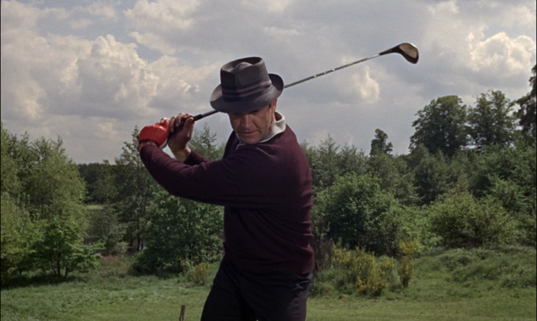 본드와 골드핑거가 골프를 치는 장면이 재미있다. 이 영화가 제작된 때가 1964년이므로 지금으로부터 거의 60년 전이다. 골프용품도 지금과 많이 다르다. 본드와 골드핑거가 입은 골프복도 고색창연하지만 재미있는 것을 골프채이다. 드라이버의 헤드 크기가 지금의 3번 우드 정도이다. 이런 골프채로 골프를 치는 것을 보니 대단하다. 골프의 스윙 폼도 지금과는 많이 다르다.