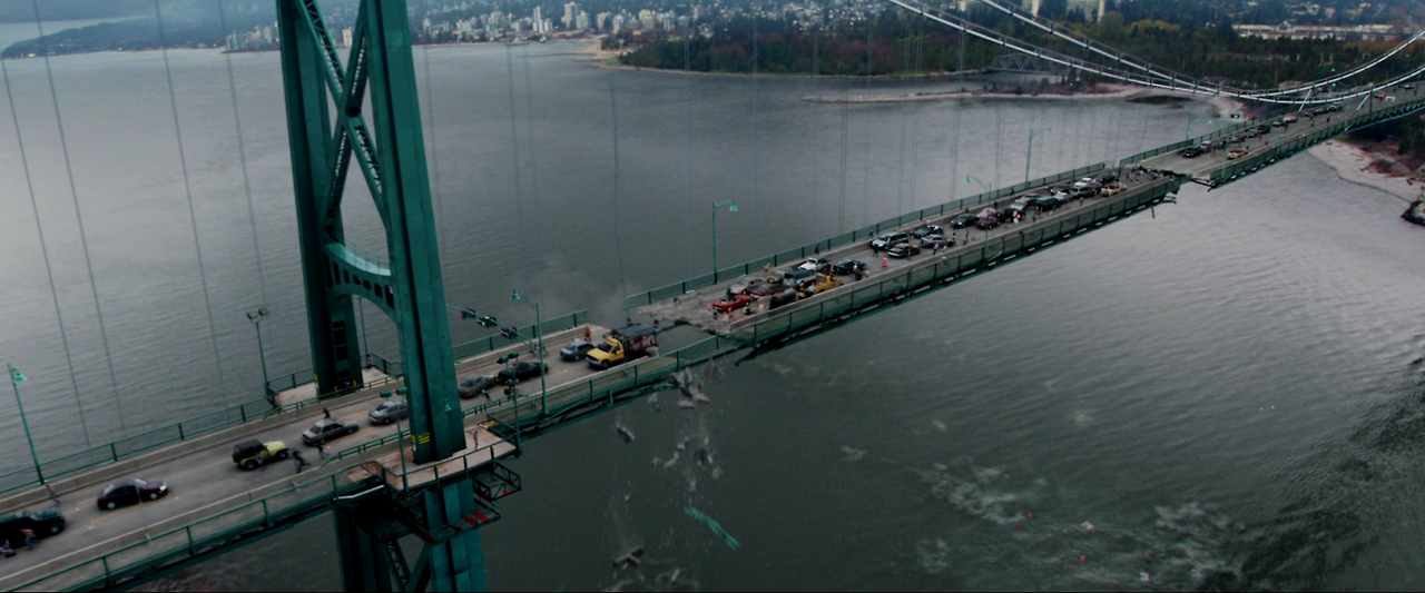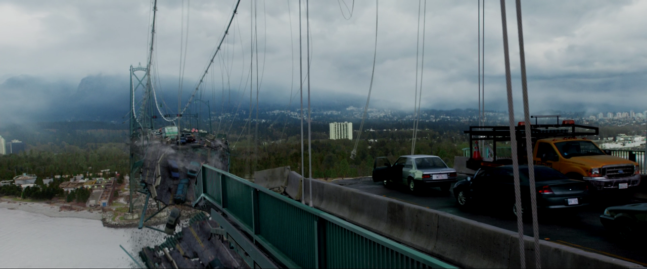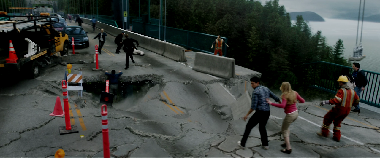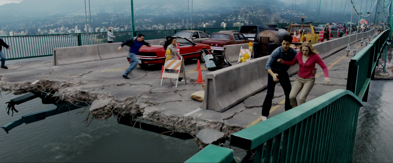 주인공 샘은 어느 제조회사의 사원으로 일하고 있는데, 회사 전 직원이 연수여행을 가게 되었다. 전 직원이 전세버스를 타고 노스 베이 브리지라는 거대한 현수교를 건너고 있었다. 다리는 공사 중이었는데, 버스가 공사 부분을 지나가는 순간 사고로 다리가 무너지기 시작한다. 직원들은 놀라서 차에서 뛰어내리지만 많은 사람이 붕괴하는 다리 위에서 떨어지거나 낙하하는 구조물에 맞아 목숨을 잃는다. 샘도 버스에서 내려 피하려 하지만 다리에서 떨어지고, 그 순간 샘은 눈을 뜬다. 샘이 꿈을 꾼 것이다. 샘은 악몽에 식은땀을 흘리면서 창밖을 내다보는데, 꿈에서 본 것과 똑 같이 공사가 진행되고, 꿈에서 본 것과 똑 같이 모든 일이 이루어지고 있었다.