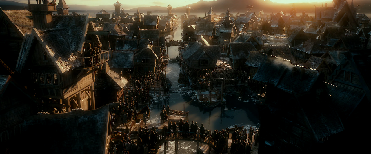 이때 나타난 호수 마을 에스가로스에 사는 활의 명수 배르도의 도움을 받아 드워프들은 마을로 잠입한다. 에스가로스는 에레보르가 있는 산 근처에 위치해 있지만, 옛날 스마우그의 습격을 받아 부를 모두 잃어버린 계곡 속 나라의 사람들이 도망해 온 곳으로써, 현재는 타락한 지도자에 의해 지배되고 있는 부패한 마을이었다. 바르도는 아이들을 키우면서 부패한 지도자에 대한 쿠데타를 계획하고 있다. 그런 가운데 만난 드와프 일행에 대해 배드도는 그들이 마을에서 떠도는 “산 아래의 왕의 부활” 예언이 현실화한 것일지 모른다고 생각한다.