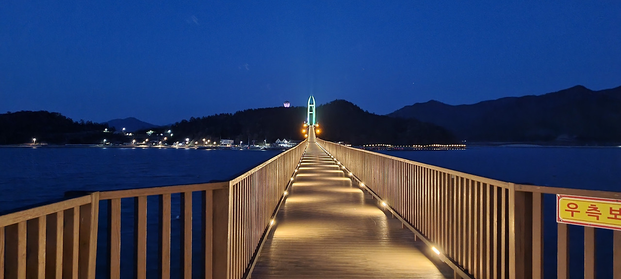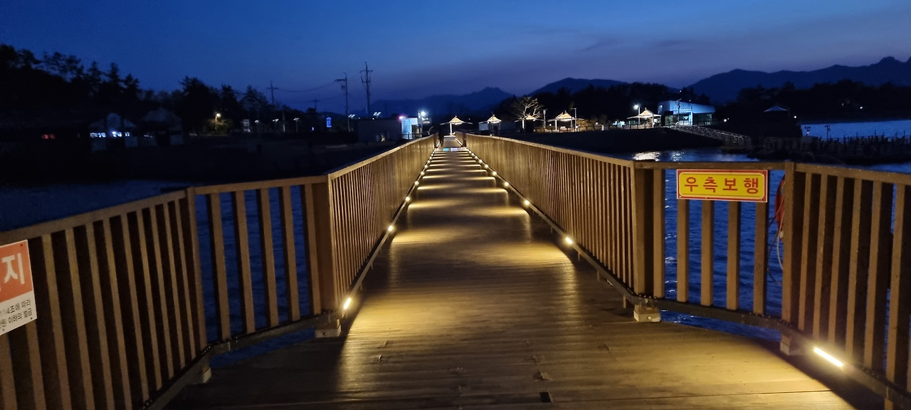 차에서 내리니 사방이 깜깜하다. 출렁다리 위에는 화려한 조명등이 켜져 있다. 다리에 올라 가우도 쪽으로 걸어가 본다. 멀리 보이는 집들의 조명과 어울려 밤바다의 전경은 아름답다. 하루 종일 따뜻하던 날씨가 밤이 되니 온도가 급속히 떨어진다. 밤바다 바람이 차다. 이러다가 감기에 걸리면 또 몇 달을 고생한다. 내일 다시 오기로 하고, 발길을 돌렸다.
