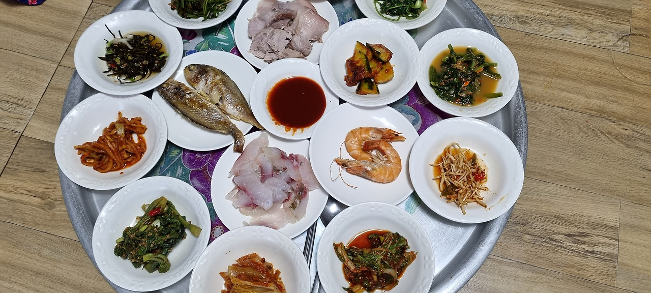 백반은 만원 짜리와 만 오천 원짜리가 있다길래, 만원 짜리를 주문하였다. 좀 있다가 백반이 나왔는데, 이건 굉장하다. 약 20가지의 반찬인데, 회와 돼지고기 수육까지 있다. 밥도 고봉으로 주다시피 하는데 아주 맛있다. 소주를 한병 주문하여 반찬을 안주로 술과 밥을 먹는다. 나물, 김치 모두 맛있다. 보통 백반집에 가변 몇몇 반찬에만 손이 가는데, 이번엔 반찬 한 가지 남김없이 싹싹 다 먹어치웠다. 다른 이들에게도 추천할만한 식당이다.