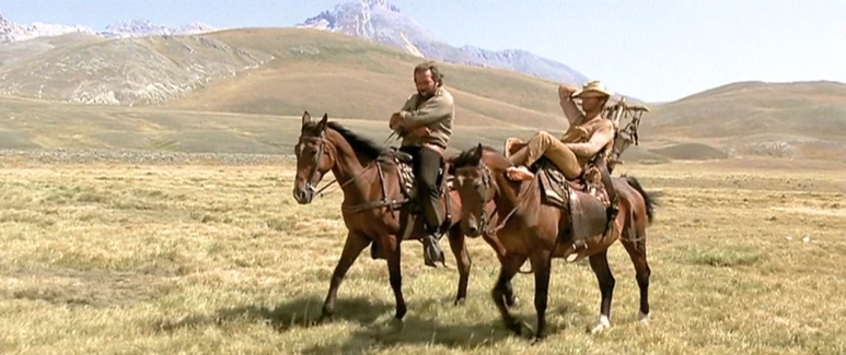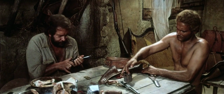 튜니티는 무기 밀매상들이 돈을 수도원에 숨겨두었다는 사실을 알게 된다. 수도원에서 악당들과 신나는 주먹싸움이 벌어진다. 전편에서 목조주택 건설현장에서 벌어지는 격투 신 이상의 재미있는 주먹싸움이다. 싸움 끝에 튜니티 형제는 악당들의 돈과 약탈품을 빼앗는다. 그러나 그때 정부의 국경 수비대와 마주치고, 밤비노가 말도둑으로 수배된 인물이라는 것이 발각되어 곤경에 빠진다. 형제는 이 위기를 빠져나가기 위해 마치 정의의 사도인양 악당들로부터 뺏은 돈과 재물을 수비대에게 넘긴다. 그리고는 걸음아 날 살려라 하고 도망친다.