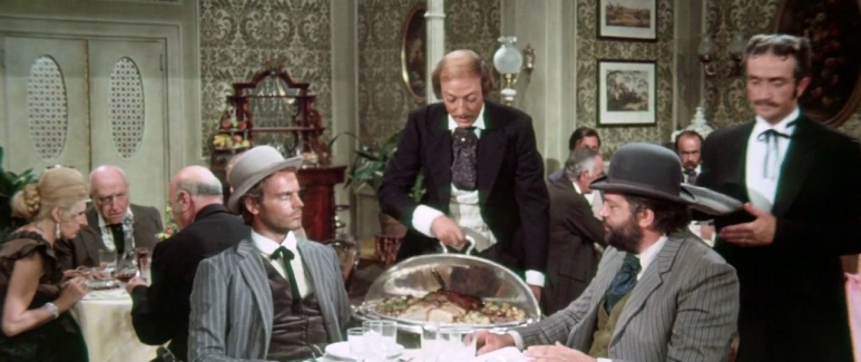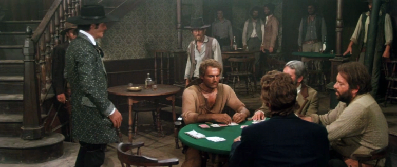 마을에 도착한 튜니티는 술집에 들어가서 포커를 한다. 이미 포카를 하고 있던 자들이 그들의 현란한 카드 셔플링 솜씨를 보여주지만, 튜니티의 실력은 그보다 한참 위이다. 카드를 마치 떡 주무르듯이 가지고 논다. 튜니티는 판돈을 몽땅 휩쓸어 그 돈으로 형제는 좋은 양복을 맞춰 입는다.