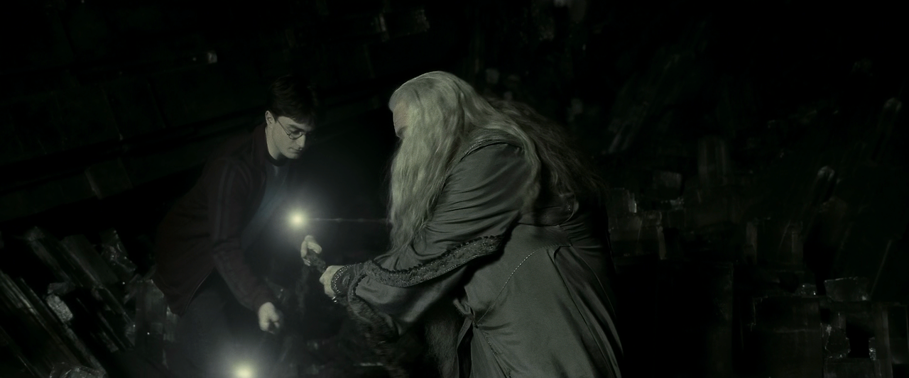 해리는 혼혈 왕자의 책에서 익힌 어둠의 주문으로 스네이프를 공격하지만 주문이 통하지 않고 허무하게 쓰러진다. 그리고 책을 만든 “혼혈 왕자"의 정체가 다름 아닌 스네이프라는 사실을 알게 된다. 스네이프는 해리를 기절시키고 드레이크 등과 함께 함께 도망친다. 만신창이가 된 해리는 덤블도어의 유체 옆으로 돌아와 영혼 상자인 ”은의 로켓“의 뚜껑을 연다. 그러나 로켓으로부터 나온 'R.A.B.'라는 사람의 글에는 진짜 영혼 상자를 파괴하기 위하여 가짜와 바꿔치기하였다고 쓰여있었다. 결국 덤블도어는 가짜 영혼 상자를 파괴하기 위해 목숨까지 걸었던 셈이었다.