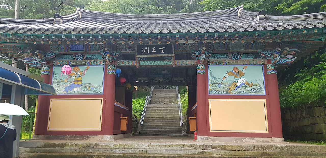 관촉사 매표소를 지나면 바로 문이 나온다. 보통 절들은 정문을 지나면 한참 걸어들어가 강독(講讀)을 하는 건물이 나오고, 그 아래 있는 계단을 지나면 대웅전이 절 마당이 있고, 마당을 지나 대응전이 있는 모습을 하고 있다. 그런데 관촉사는 전혀 다르다. 정문을 지나면 바로 가파른 돌계단길이 나온다. 계단길을 오르면 강독을 하는 건물이 나오고, 그 아래로 다시 계단을 오르면 아담한 마당과 함께 대웅전이 나온다.