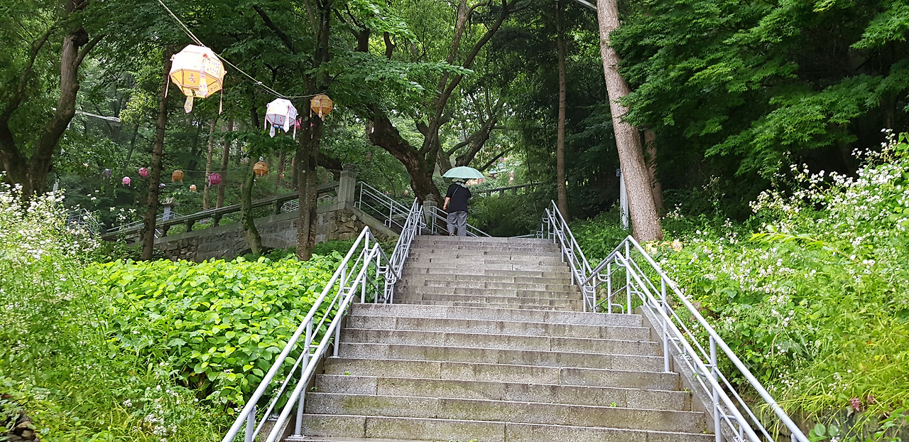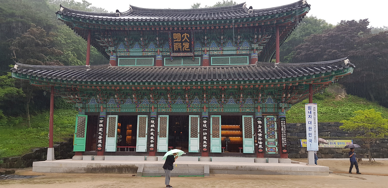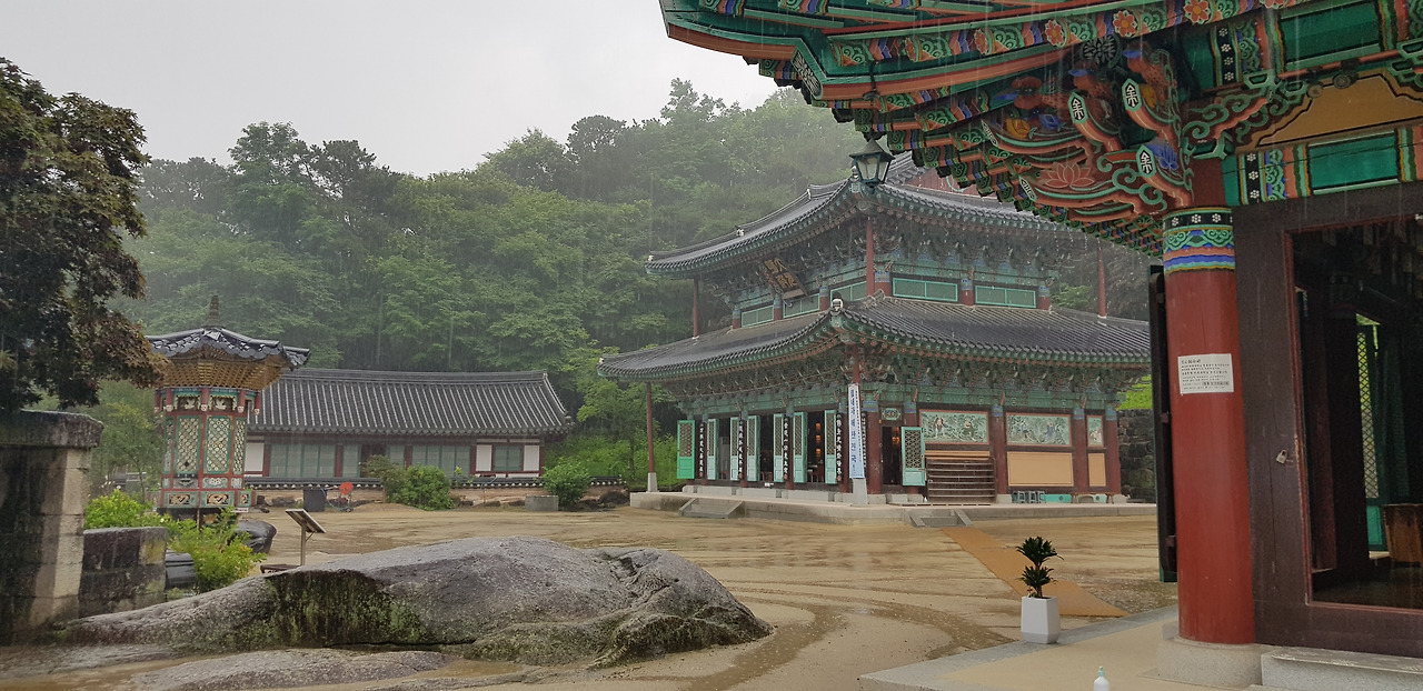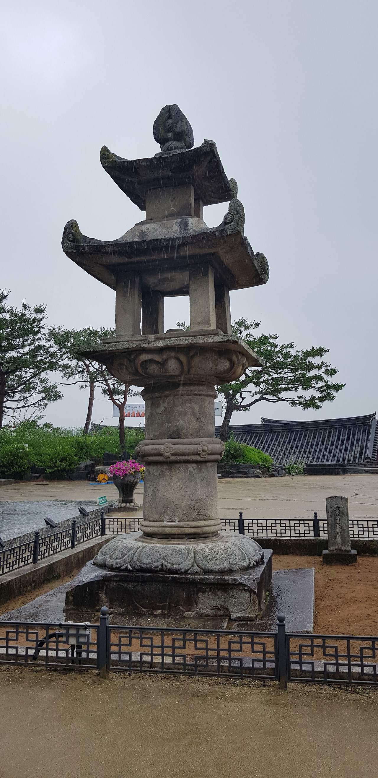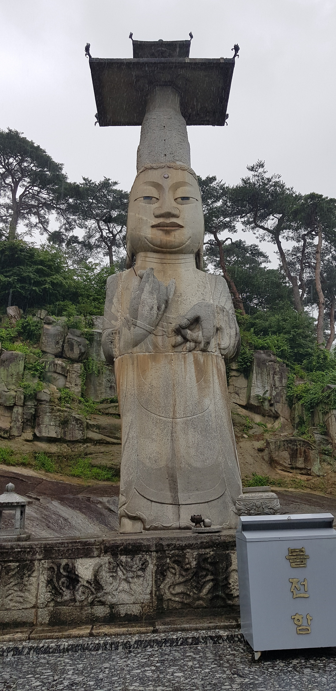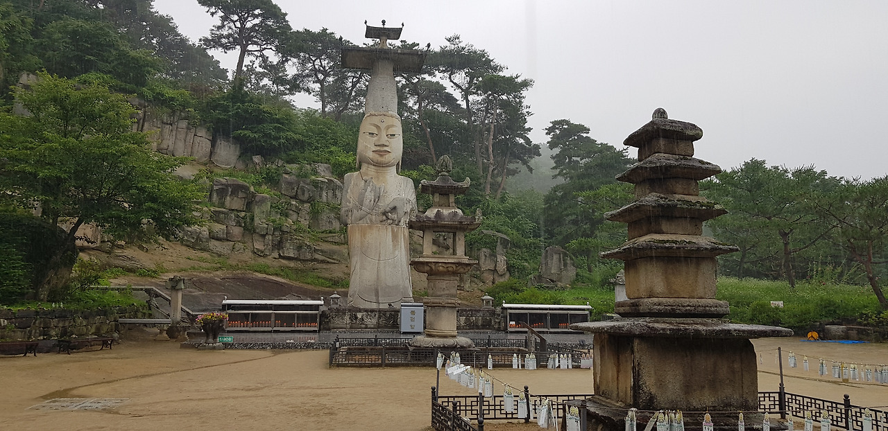 내가 미륵불 부근에서 사진도 찍고 이곳저곳 돌아다니는 동안 집사람은 대웅전에서 불공을 드리고 나왔다. 비가 점점 더 거세진다. 대웅전 옆에 작은 벤치가 있다. 벤치에 앉아 멍하니 아무생각도 없이 내리는 비와 미륵불을 보고 있자니 시간이 금방 지나간다. 옆에 앉는 집사람은 연신 미륵불이 잘 생겼다고 말한다. 내가 미륵불이 예술성이 떨어져 국보로 지정되지 못하다가 최근에 와서 국보로 승격되었는데, 뭐가 잘 생겼느냐고 타박을 하자, 집사람은 자기가 보긴 잘생기기만 하였다고 하며, 주장을 굽히지 않는다.