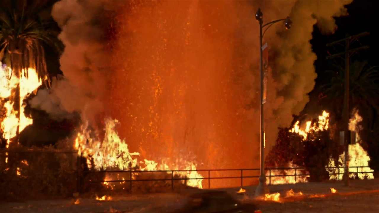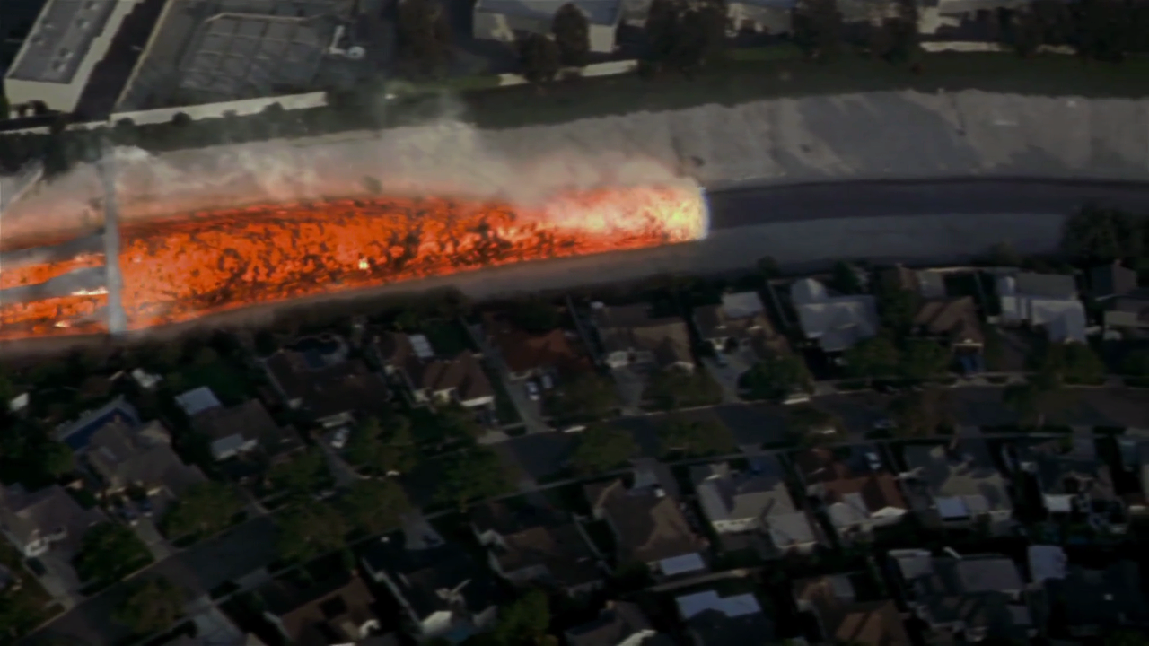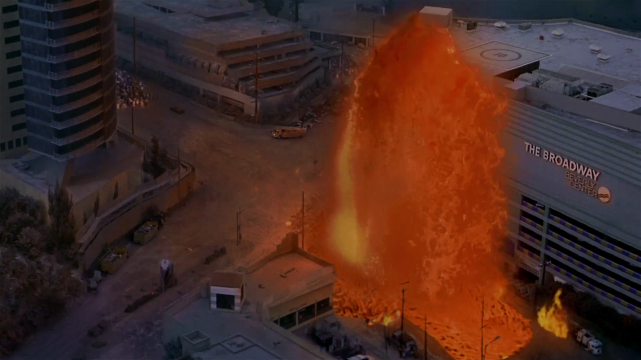 그 직후 다시 지진이 일어나기 시작하고, 연못이 폭발함과 동시에 빌딩의 유리창이 일제히 깨져버린다. 겨우 몸을 피해있던 마이크는 연못으로부터 솟아 나오는 용암류를 목격한다. 미국 지진조사소로부터도 LA에서 화산 폭발이 시작되었다고 발표하고, 화구로부터 윌셔 대로로 흘러나온 용암이 케리가 탄 차로 다가온다. 차에서 탈출은 했지만 다리를 다쳐 피할 수 없는 케리에게 화산재가 떨어져 그녀는 다리에 화상을 입는다.