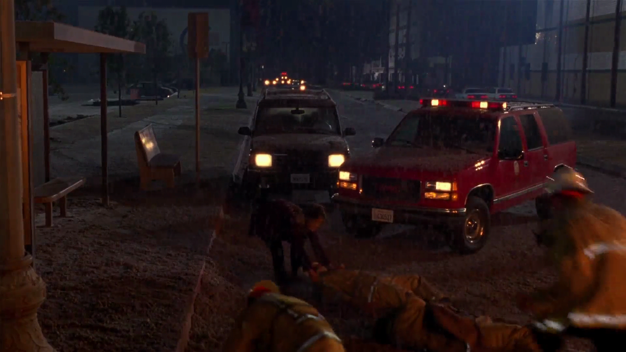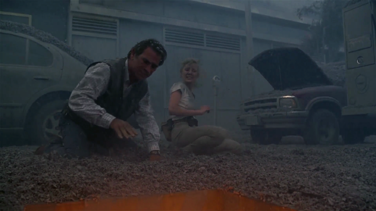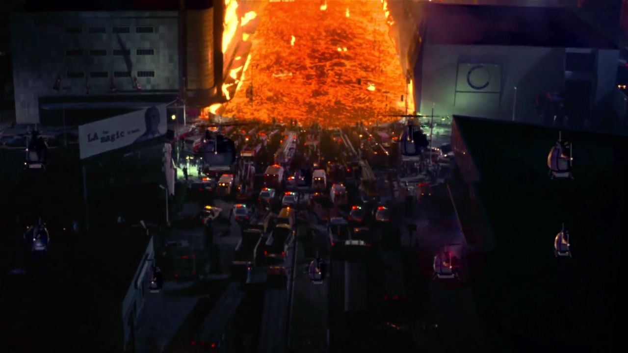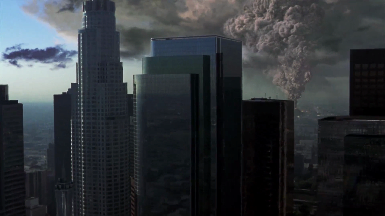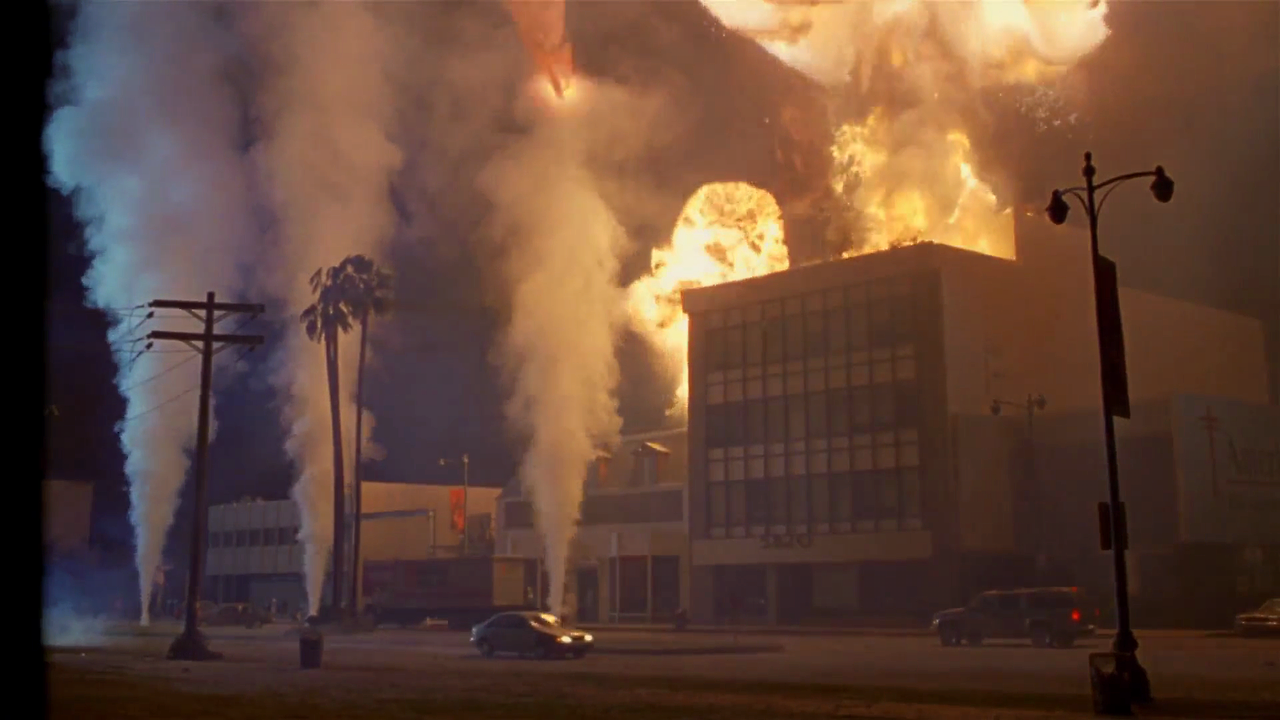 다음날 새벽에는 대지진이 발생하고, LA 각지에서 정전사태가 발생한다. 마이크가 딸 케리와 함께 차로 위기관리국으로 향하던 중, 갑자기 맨홀으로부터 증기가 뿜어 나오기 시작하는 데다, 근처에서 검은 연기가 솟아오른다. 거기서부터 불덩어리가 여러 개 날아오르더니 주위의 건물에 떨어져 폭발한다. 여러 곳에서 화재가 발생하기 시작한다. 소방차가 달려와 소화작업을 벌이고, 마이크도 케리를 차에 두고 우연히 지나가단 제이 콜드웨의 의사와 함께 부상자의 구출에 뛰어든다. 그러던 중 그때까지 계속적으로 일어나고 있던 증기 분출이 갑자기 멈추면서 일순간에 주위가 조용해진다.
