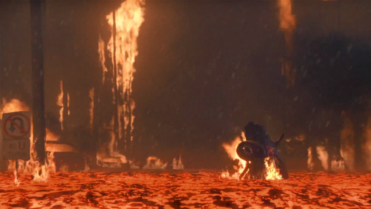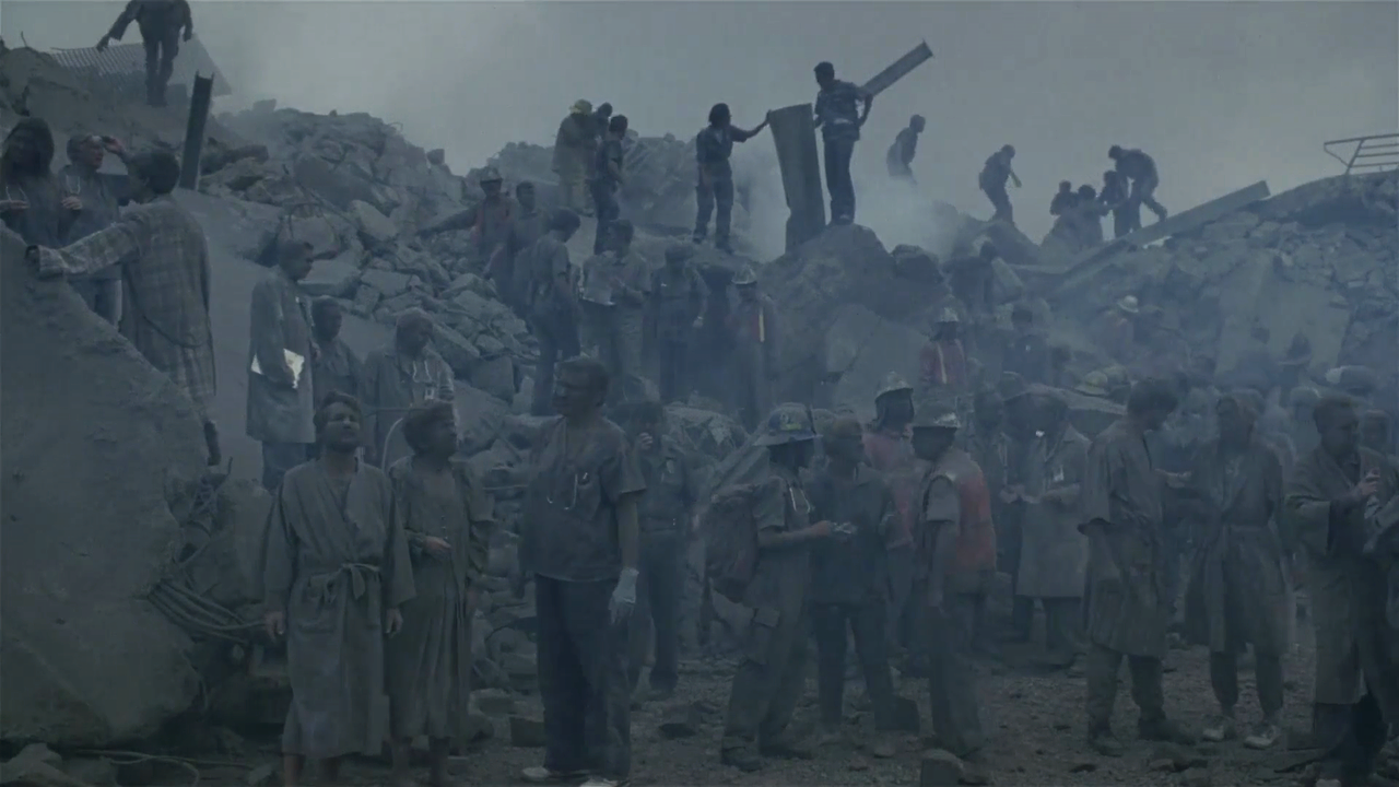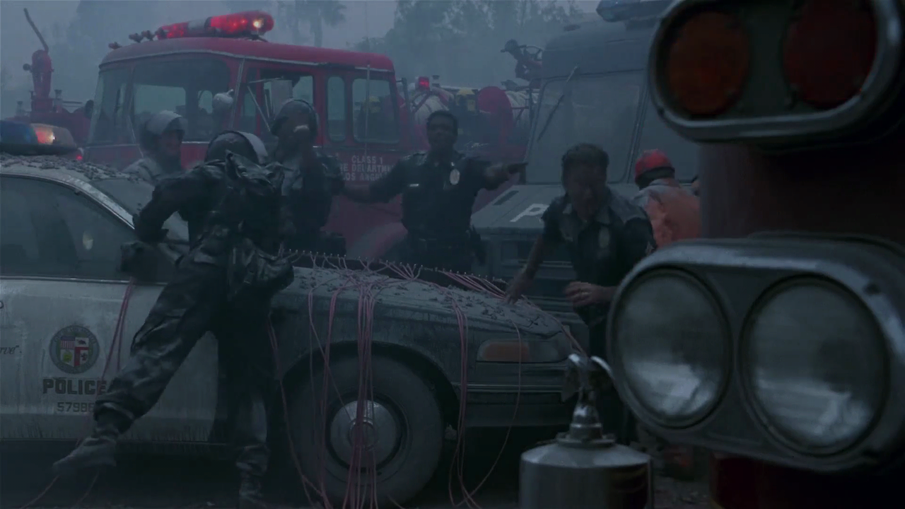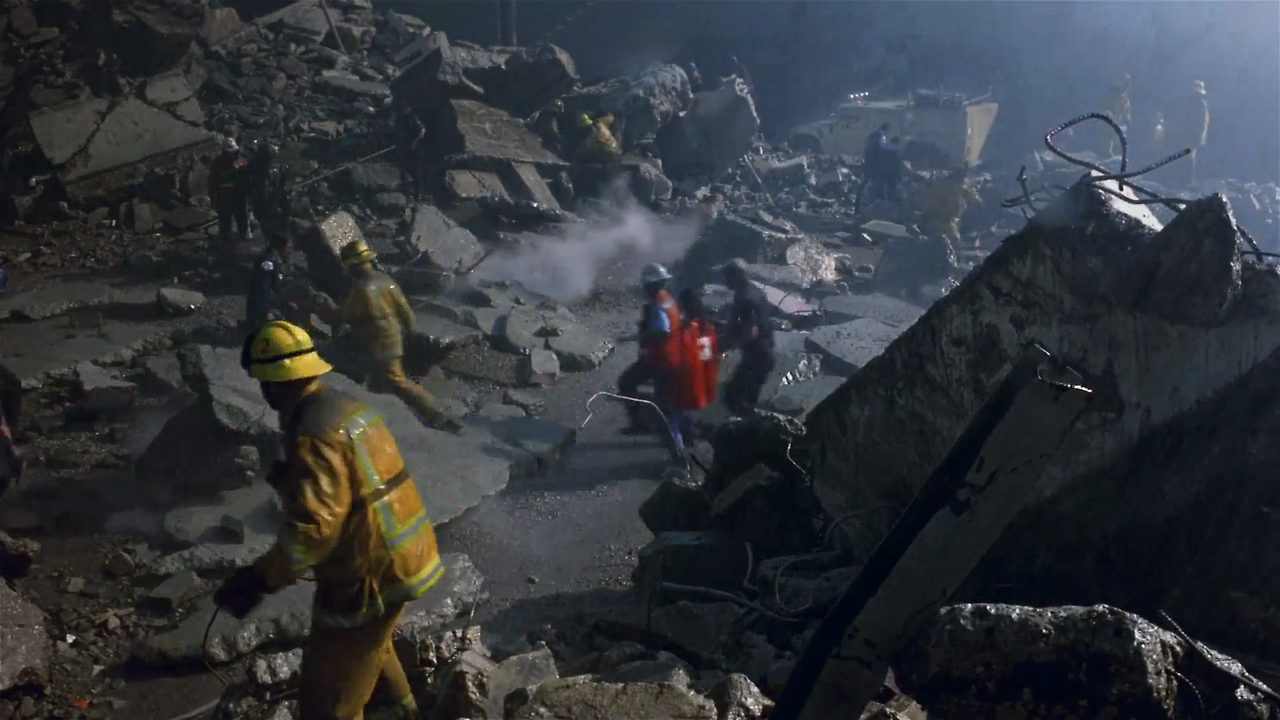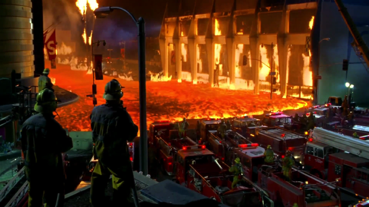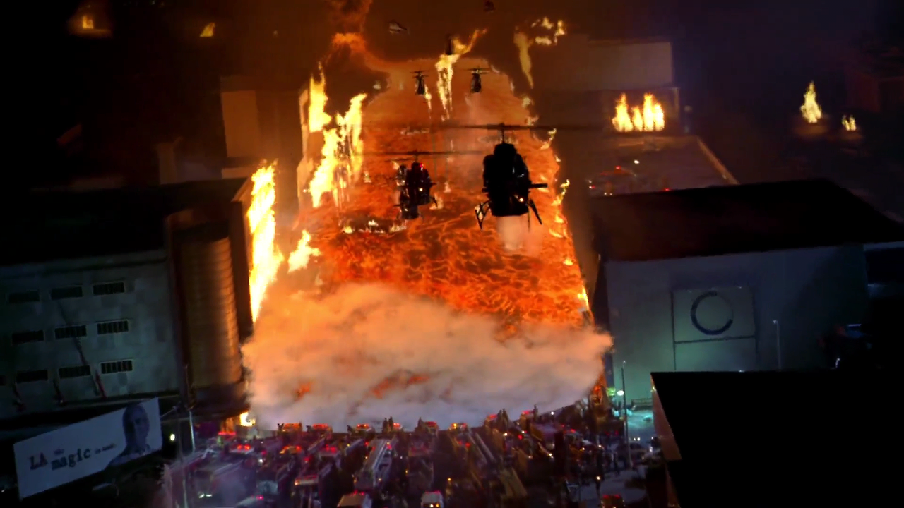 다음날 새벽에는 대지진이 발생하고, LA 각지에서 정전사태가 발생한다. 마이크가 딸 케리와 함께 차로 위기관리국으로 향하던 중, 갑자기 맨홀으로부터 증기가 뿜어 나오기 시작하는 데다, 근처에서 검은 연기가 솟아오른다. 거기서부터 불덩어리가 여러 개 날아오르더니 주위의 건물에 떨어져 폭발한다. 여러 곳에서 화재가 발생하기 시작한다. 소방차가 달려와 소화작업을 벌이고, 마이크도 케리를 차에 두고 우연히 지나가단 제이 콜드웨의 의사와 함께 부상자의 구출에 뛰어든다. 그러던 중 그때까지 계속적으로 일어나고 있던 증기 분출이 갑자기 멈추면서 일순간에 주위가 조용해진다.