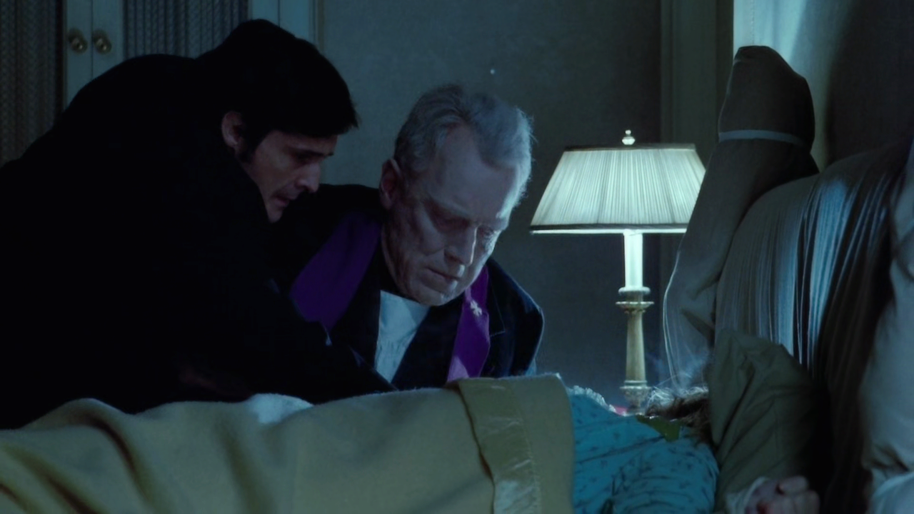 안개 낀 날의 밤, 크리스의 집을 방문한 메린은 카라스의 도움을 받아 리건으로부터 악마를 쫓아내는 의식을 치른다. 두 신부는 기도 소리를 계속 소녀에게 들려주고, 악마도 여기에 대항하여 신부들을 동요시켜 신부들과 악마 사이의 긴장은 계속된다. 리건이 괴로워하는 모습을 보고 카라스는 마음이 아프지만, 메린은 악마가 우리로 하여금 인간을 구원하지 못하게 하지만, 우리는 포기해서는 안된다고 격려한다.