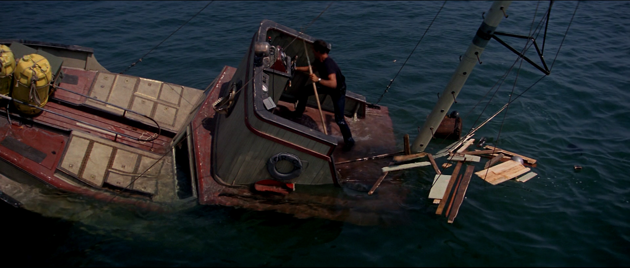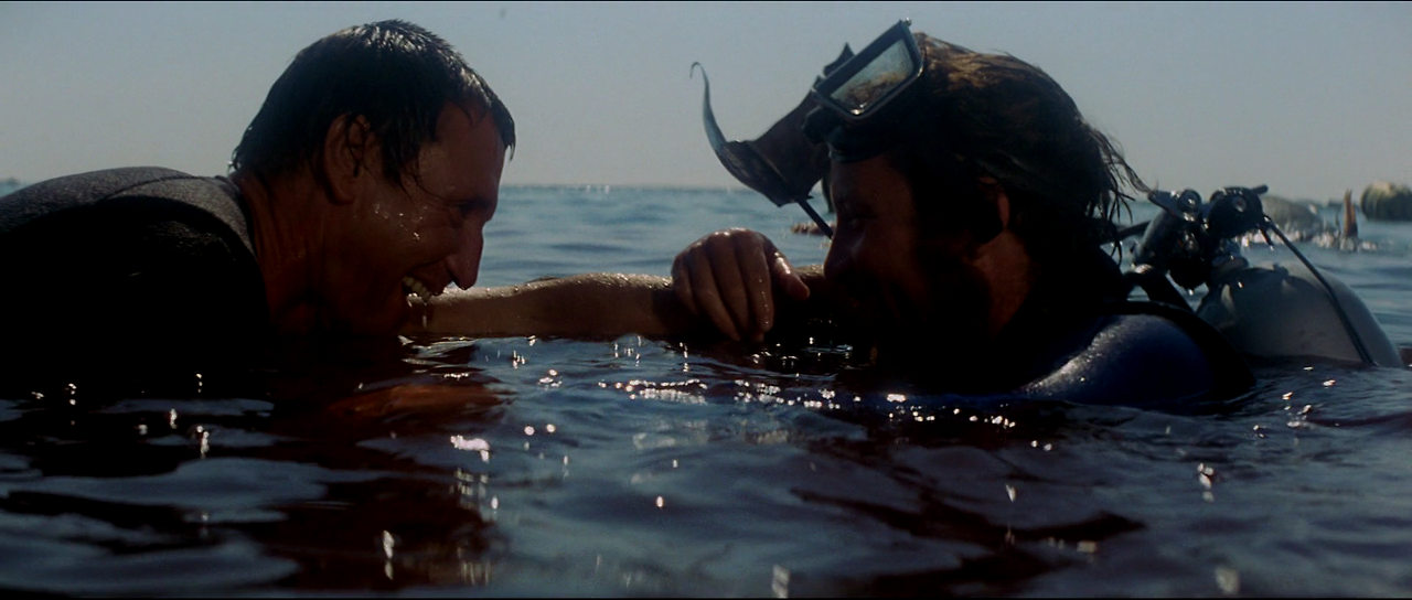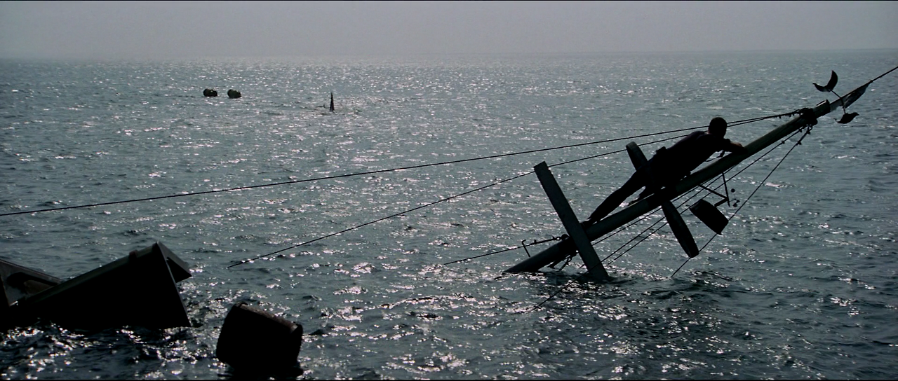 드디어 두 사람은 식인 백상아리를 죽이는 데 성공하고 서로의 생존을 기뻐한다. 배는 이미 완전히 파괴되어 두 사람은 배의 잔해 부유물을 잡고 섬으로 헤엄쳐 돌아온다.