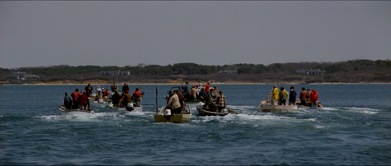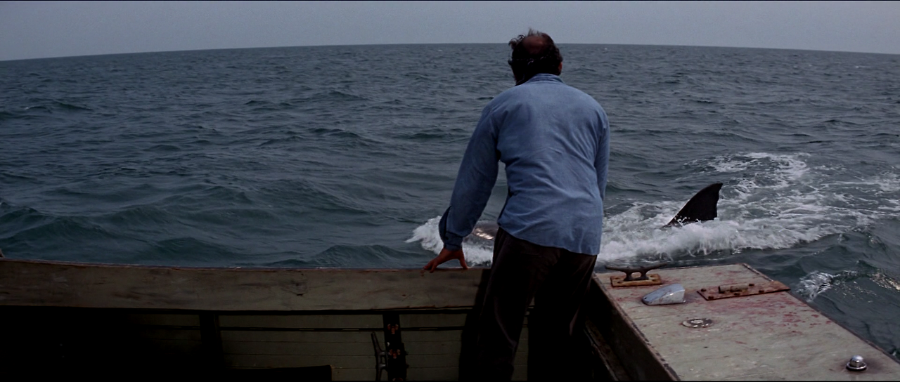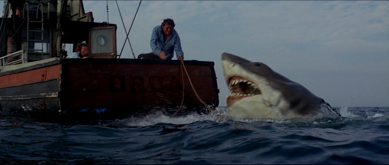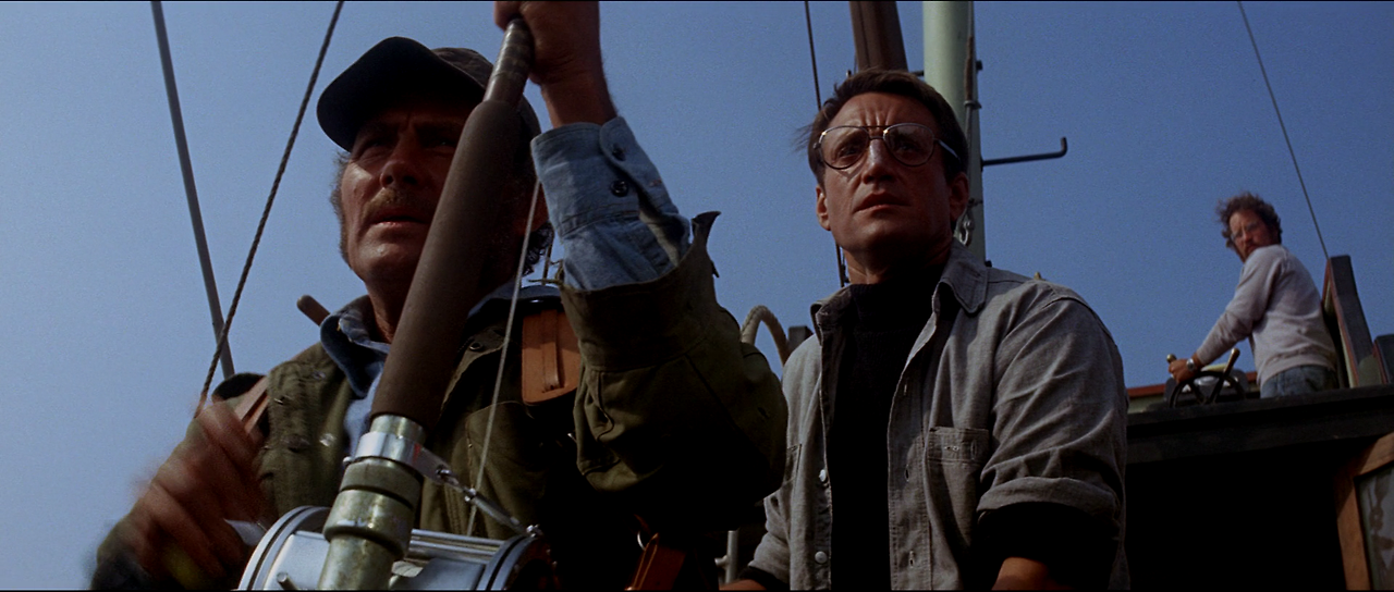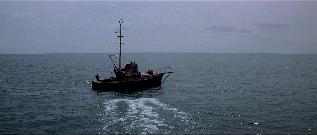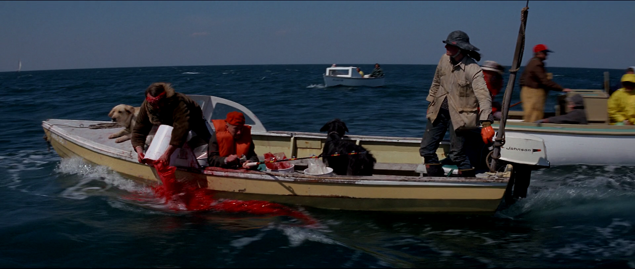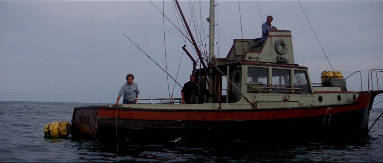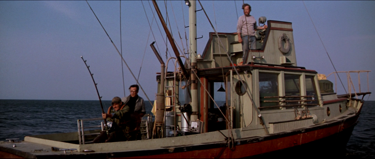 세 사람이 출항을 하였지만 퀸트가 후퍼를 무시하는 바람에 서로 사이가 좋지 않다. 드디어 길이가 8미터 가까이 되고 무게가 3톤은 될 것 같은 대형 백상아리가 나타난다. 퀸트는 부표 대신에 술통을 로프에 묶어 작살총으로 상어를 쏘지만 급송서 벗어나고, 거대 상어도 작살에 꽂힌 채 괴력을 발휘하여 술통을 끌고 바닷속으로 사라져 버린다.