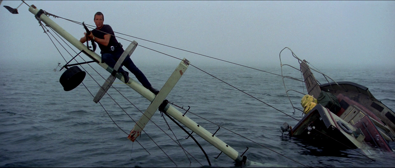 날이 밝자 상어가 다시 찾아온다. 브로디는 해안경비대에 구조 요청 무전을 보내려고 하나, 퀸트는 자신이 상어를 잡아야 한다면서 무전기를 부숴버린다. 퀸트와 브로디는 총으로 상어를 공격하지만, 상어에게 별다른 타격은 못 입힌다. 상어 몸에 박힌 작살에 연결된 밧줄을 배에 걸어 상어를 끌고 갈려고 했는데, 그것이 오히려 상어가 배를 끌고 가도록 하는 꼴이 되어버렸다. 배는 상어에게 끌려가면서 심하게 파괴된다.