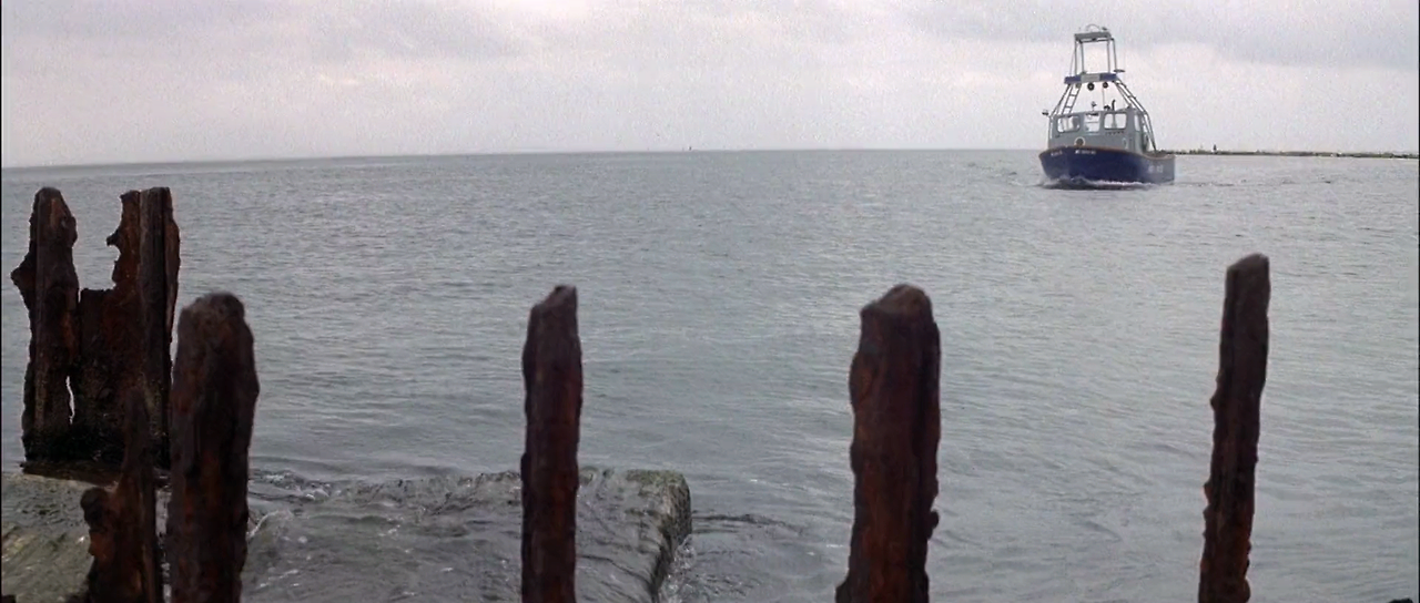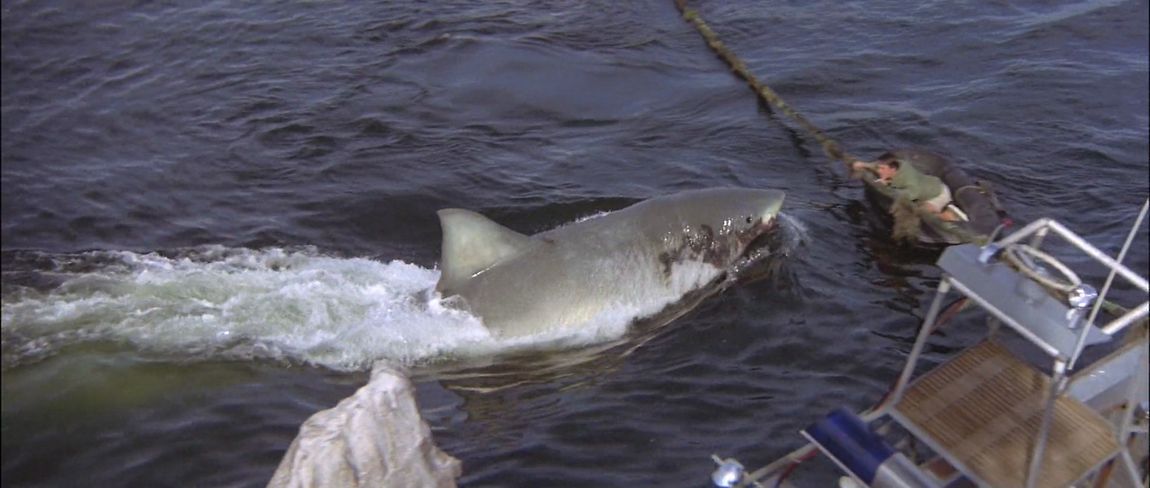 세 사람이 출항을 하였지만 퀸트가 후퍼를 무시하는 바람에 서로 사이가 좋지 않다. 드디어 길이가 8미터 가까이 되고 무게가 3톤은 될 것 같은 대형 백상아리가 나타난다. 퀸트는 부표 대신에 술통을 로프에 묶어 작살총으로 상어를 쏘지만 급송서 벗어나고, 거대 상어도 작살에 꽂힌 채 괴력을 발휘하여 술통을 끌고 바닷속으로 사라져 버린다.