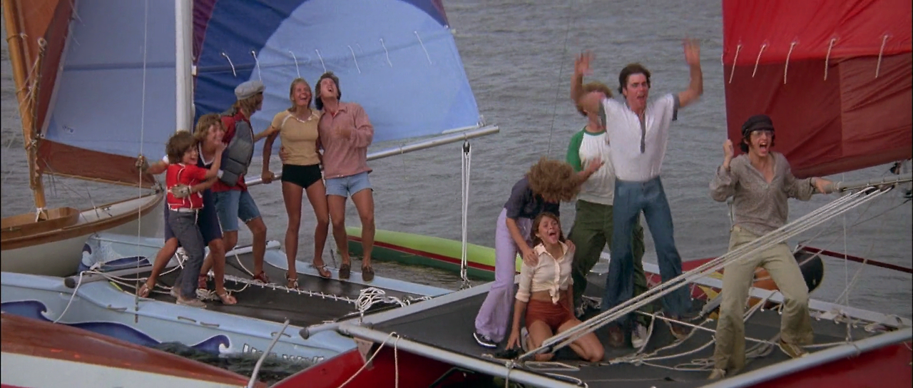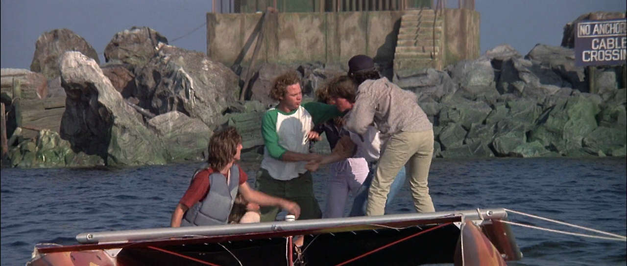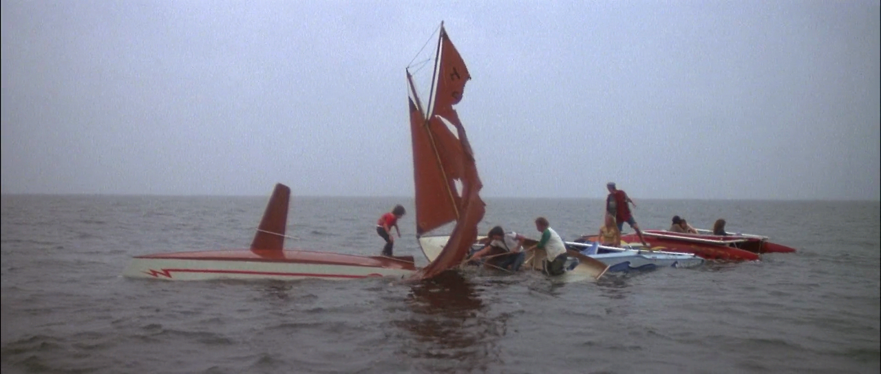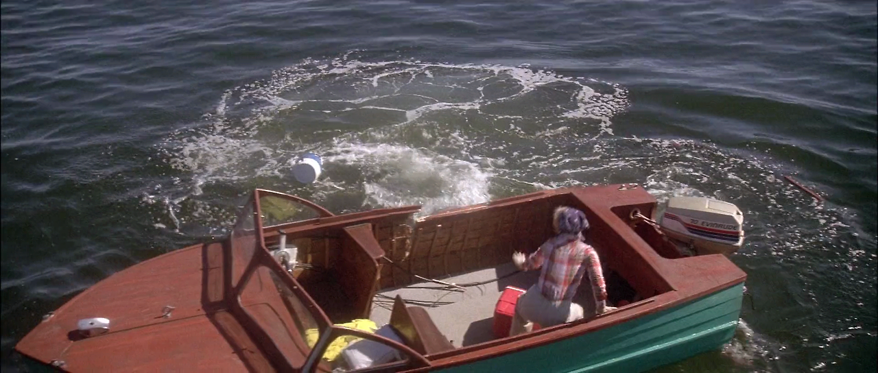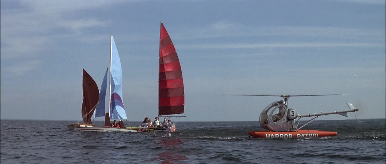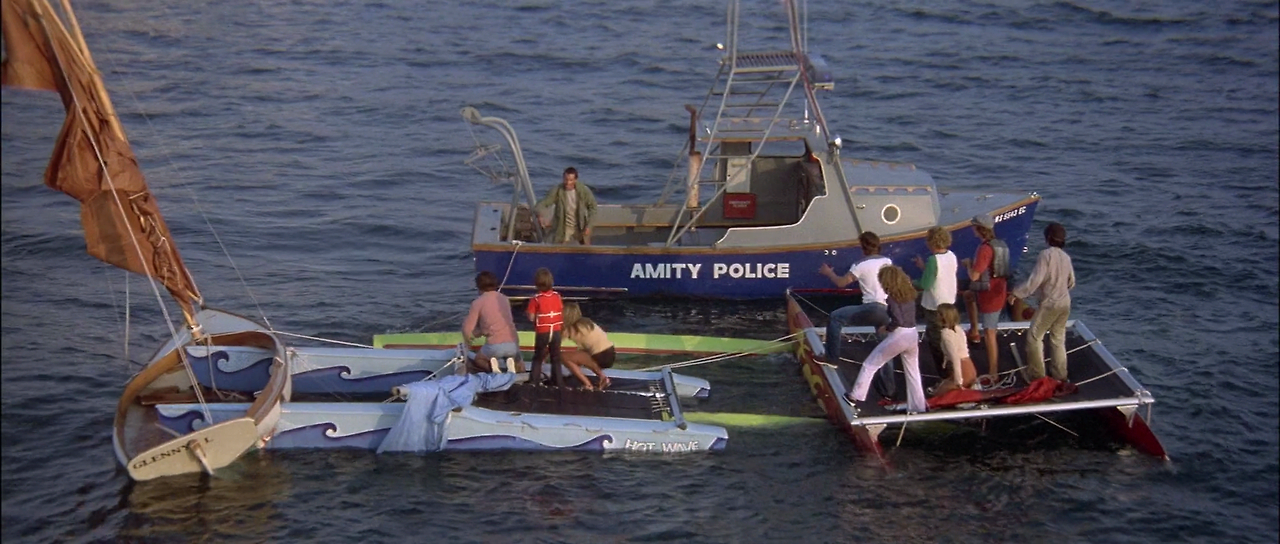 날이 밝자 상어가 다시 찾아온다. 브로디는 해안경비대에 구조 요청 무전을 보내려고 하나, 퀸트는 자신이 상어를 잡아야 한다면서 무전기를 부숴버린다. 퀸트와 브로디는 총으로 상어를 공격하지만, 상어에게 별다른 타격은 못 입힌다. 상어 몸에 박힌 작살에 연결된 밧줄을 배에 걸어 상어를 끌고 갈려고 했는데, 그것이 오히려 상어가 배를 끌고 가도록 하는 꼴이 되어버렸다. 배는 상어에게 끌려가면서 심하게 파괴된다.