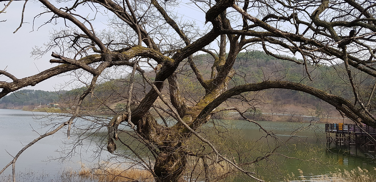 고복 저수지는 잘 정비되어 있다. 가장자리에는 나무로 된 산책로가 설치되어 있는데, 일주하면 거의 10킬로 가까이 되어 보인다. 산책로 주위에 서있는 나무들은 곧 새잎을 싹 튀울 모습이다. 늘어서 있는 나무들이 연한 연두색을 띠고 있다.
