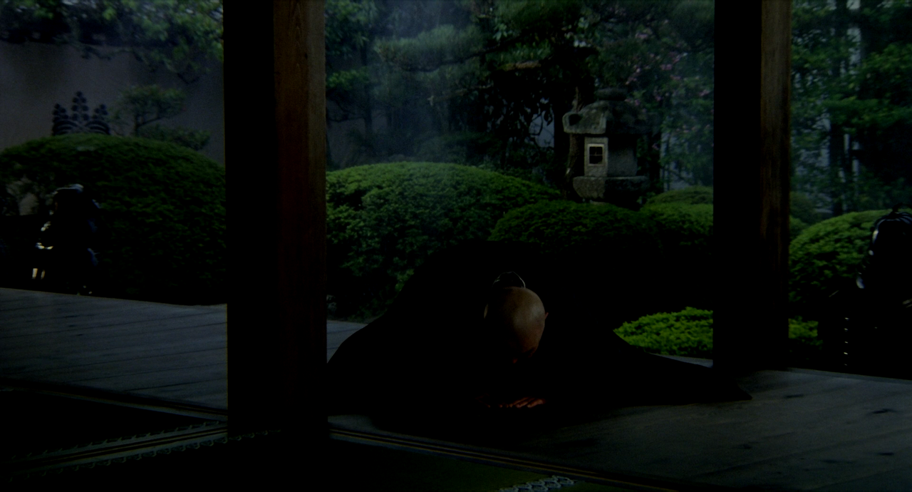 히데요시가 차아와의 사이에서 태어난 아들과 지구의를 돌리며 놀고 있을 무렵, 리큐는 무사들의 주검이 널린 대나무 숲 속을 걸어간다. 그리고 스스로 죽는다.