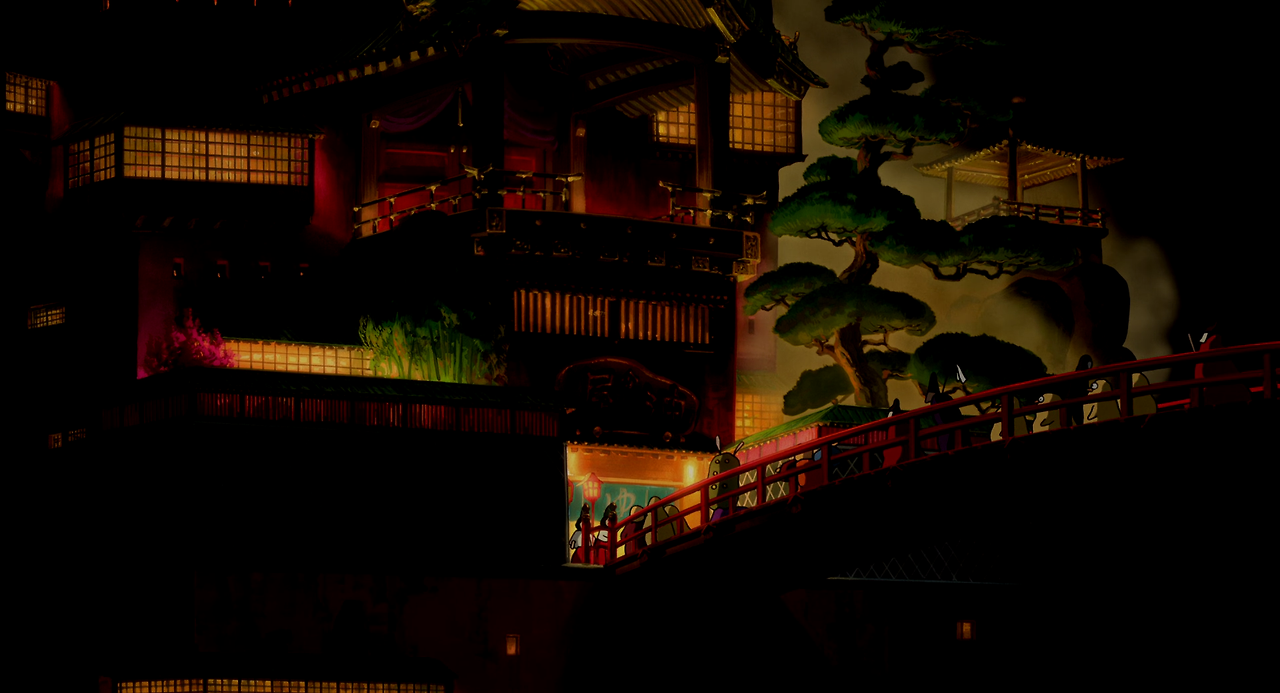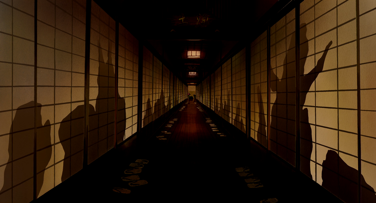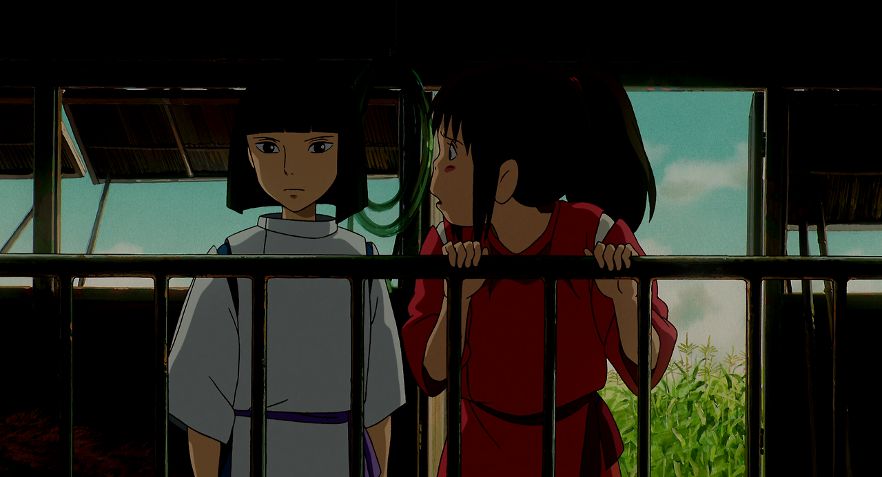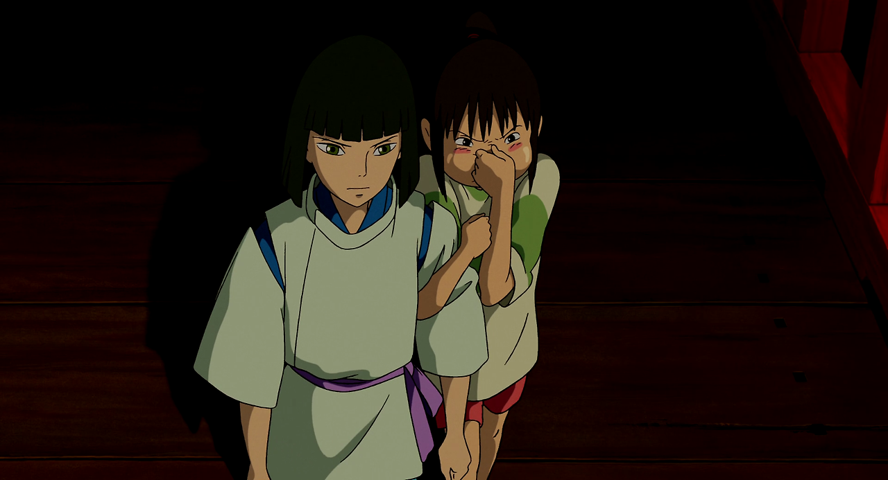 조금 걷다 보니 온천여관처럼 보이는 큰 건물이 보이고, 그 앞에는 나무다리가 걸려있다. 치히로가 다리 아래로 지나가는 기차를 보고 있자니 누군가가 큰 목소리로 “빨리 돌아가!”라며 큰 소리를 친다. 이미 해가 지고 있어 치히로는 다시 아빠 엄마가 음식을 먹고 있던 식당으로 돌아가는데, 그곳에는 아빠 엄마는 보이지 않고 두 마리의 큰 돼지가 있을 뿐이었다. 음식을 함부로 먹은 벌로서 그들은 돼지로 변해 버린 것이었다. 치히로가 다시 터널을 통해 그곳을 빠져나오려고 했지만, 터널로 가는 길은 어느새 큰 강으로 변해버렸다. 강을 건너온 배에서는 괴물처럼 생긴 동물들이 내리고 있었다. 치히로는 어찌할 바를 모르고 있는데, 조금 전에 치히로에게 돌아가라고 소리쳤던 “하쿠”라는 소년이 나타나 구해준다.