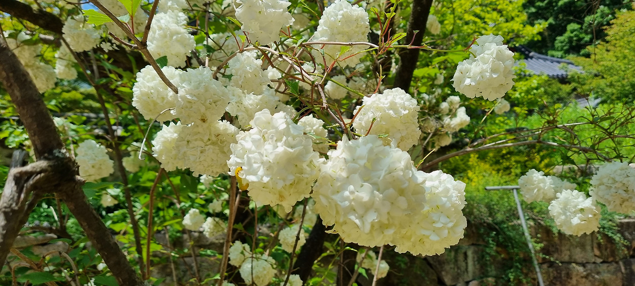 대웅전 옆에 수국과 흡사한 꽃을 비운 큰 꽃나무가 보인다. 꽃은 아무리 봐도 수국 갇은데, 수국이 이렇게 큰 나무 일리는 없다. 물어보니 이 꽃은 <불두화>라고 한다. 그리고 꽃 모습으로 인하여 나무수국이라 하기도 한단다. 정말 탐스런 꽃이다. 나도 한번 심어보고 싶은 마음이 든다. 내년에는 한번 심어 보아야겠다.