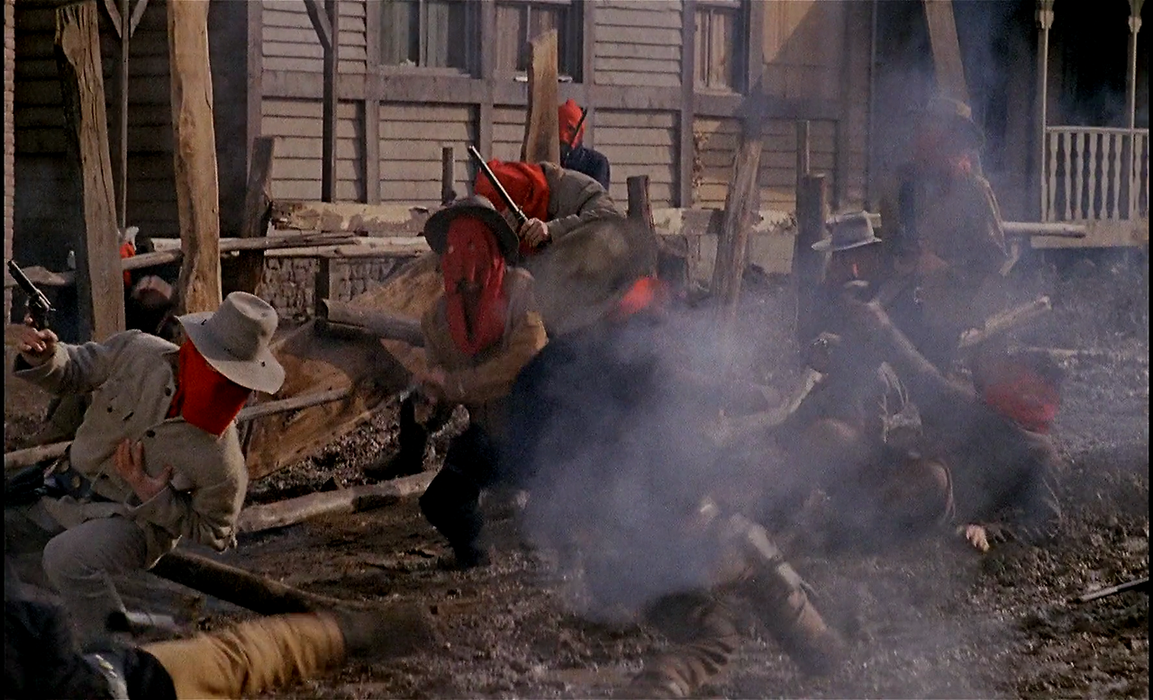 마을에 들어서자마자 장고는 술집에서 만난 잭슨의 부하 중 한 명인 조나단 신부를 도발하고, 그 이야기를 엿듣고 술집에 들어온 잭슨의 부하들을 모두 쏴 죽인다. 잭슨은 40명의 부하들을 이끌고 복수하러 오지만, 장고는 관에서 꺼낸 기관총으로 반격한다. 에 반격합니다. 그러나 장고는 도망치는 잭슨을 놓아주고, 술집의 주인인 나다니엘과 함께 잭슨의 부하들을 묻으러 간다. 매장을 마친 장고는 옛날 자신의 연인이 잭슨에서 살해당했다는 이야기를 해준다.