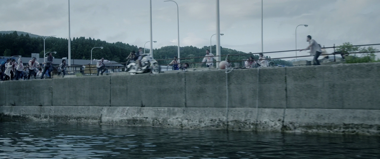 한편 좀비에게 포위된 무네가타는 다른 사람들이 탈출에 성공한 것을 알고 이제 스스로 최후를 맞이하려고 하지만, 사쿠다가 어선에 실린 음향 시스템을 작동시켜 좀비를 유인하자, 좀비들은 차례차례로 바다에 뛰어들어 사라져 간다. 사쿠다는 부상으로 죽고 말지만, 무네가타, 신야, 세이라 등은 무사에 섬을 탈출하는데 성공한다.
