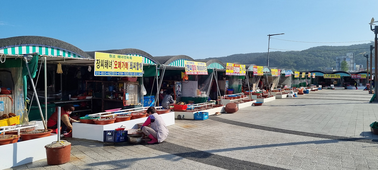죽도로 들어가는 다리 입구 넓은 터에는 해물을 파는 포장집이 줄지어 있다. 유튜브 먹방에서 보던 <기장 해녀촌>이 바로 여기가 아닌가 생각된다. 여기서 먹을 마음은 없었지만, 일단 한번 둘러보며 구경을 하기로 하였다. 소라, 전복, 해삼, 멍게, 개불을 포함한 갖은 종류의 해산물이 풍성하다. 이곳에서 장사를 하는 아주머니, 할머니들이 직접 채취한 것들인지 아니면 물건을 받아와 판매를 하는 것인지 어느쪽인지는 잘 모르겠다. 어쨋던 여기는 각종 신선한 해산물을 값싸게 먹을 수 있는 곳이라 한다.
