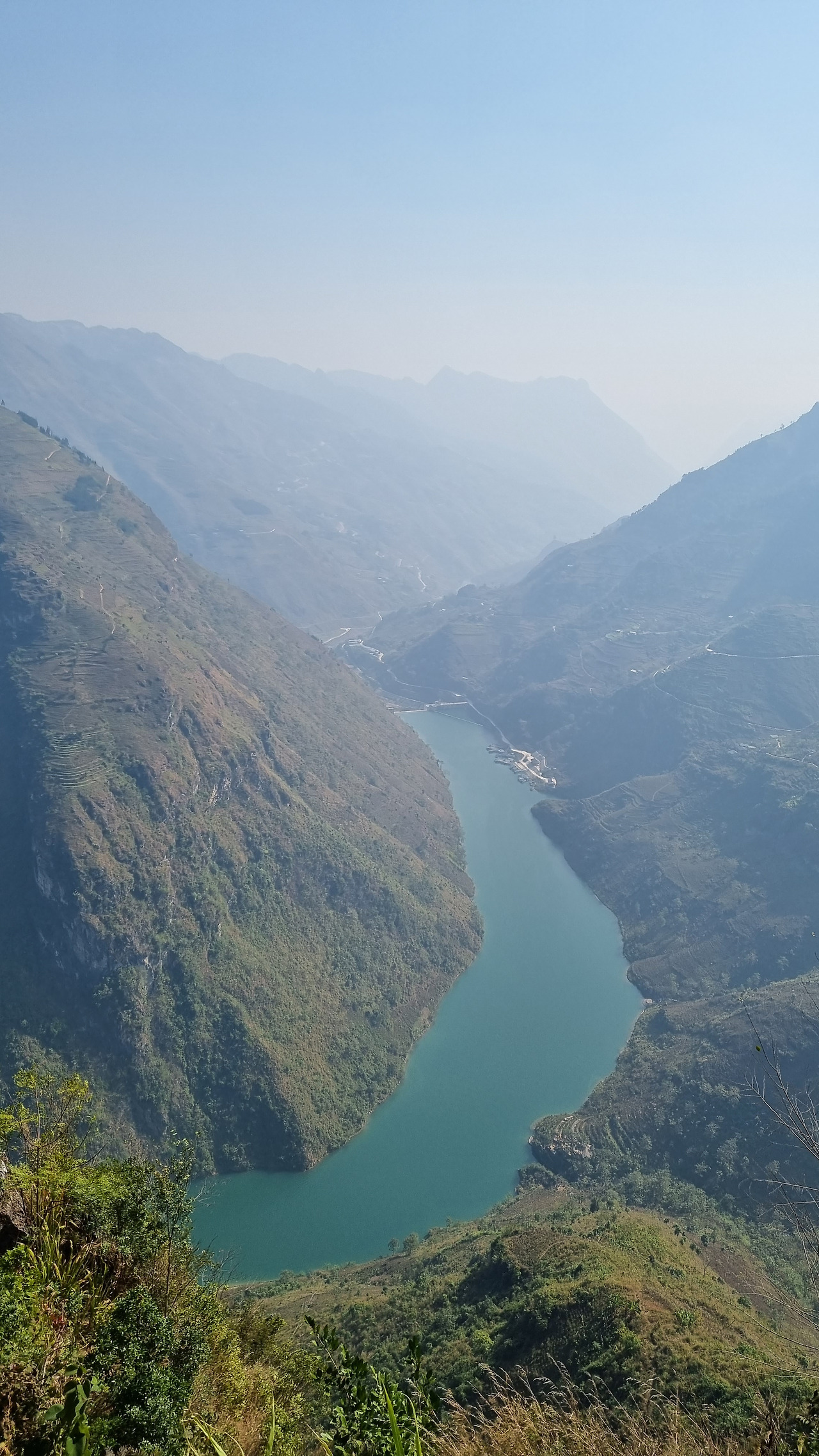 다시 조금 달리다 높은 곳에 위치한 휴게소 앞에 세워준다. 휴게소로 들어가니 저 아래 마피렝 협곡이 보인다. 장엄한 풍경에 숨이 막힌다. 협곡 아래는 푸른 물로 차있다. 작은 댐을 만들어 물을 가두어 둔 것이다. 이곳 휴게소에서 협곡 아래까지는 높이가 아무리 못돼도 1킬로는 될 것 같다. 휴게소를 나와 운전사에게 협곡으로 내려가자고 했다. 오토바이로 끝도 없이 내려가는 느낌이다. 길의 경사가 10미터에 1미터씩 낮아진다고 가정하면, 1킬로를 내려가기 위해선 10킬로를 달려야 한다.
