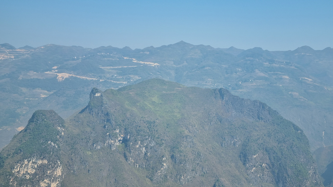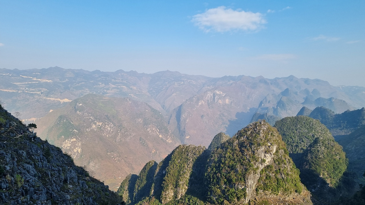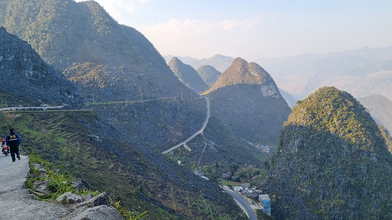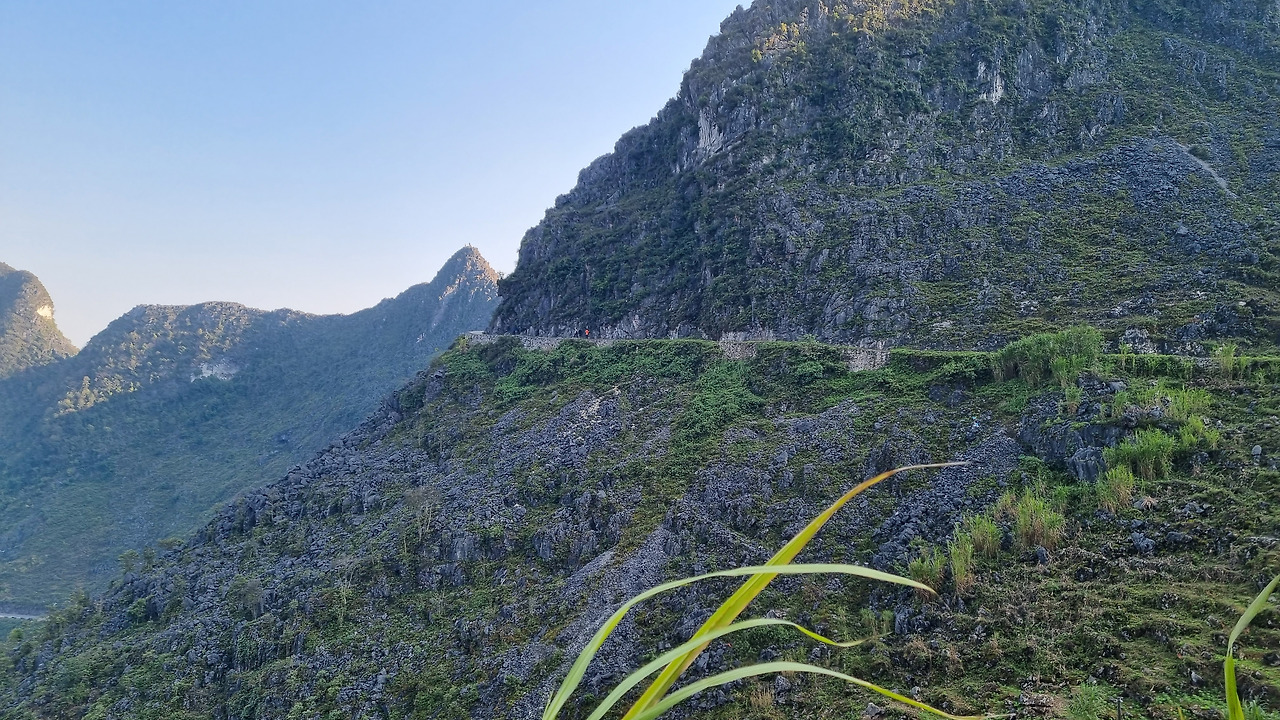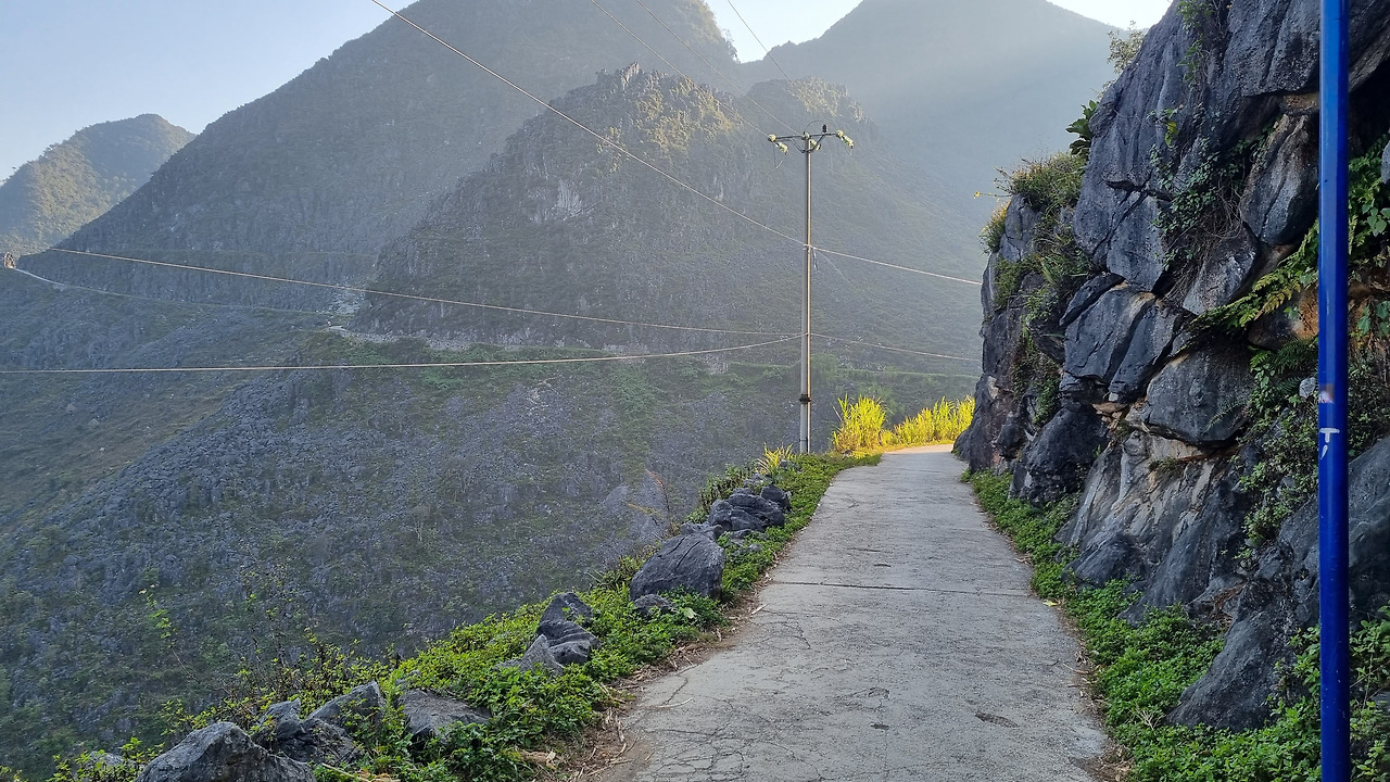 마피렝 협곡에서 올라오니 오후 3시 가까이 되었다. 그만 숙소로 돌아갈까 하는데 "스카이 워크"가 머리에 떠오른다. 그리로 가자고 하였다. 우리나라에는 요즘 관광지 곳곳에 스카이 워크가 만들어져 있지만, 하장 루프의 스카이 워크는 자연이 만들어 낸 하늘 길이다. 스카이 워크가 있는 곳은 바로 오전에 들렀던 건설 사망자 기념탑이 있는 곳이었다. 탑 옆쪽으로 좁은 산길이 있는데, 이 길이 바로 저 위의 바위산 뷰 포인트로 연결되는 스카이 워크이다. 폭 3미터 정도의 좁은 길이 산 위를 향해 마치 잔도처럼 뻗어있다. 상당히 멀어 보이는데, 막상 걸으면 30-40분 정도에 올라갈 수 있다. 동네사람들의 오토바이를 타고 올라갈 수도 있다.