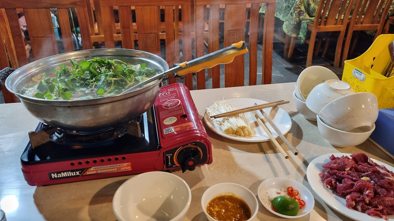 야시장은 썰렁했다. 수십 군데 음식점이 있었으나 손님은 거의 보이지 않는다. 별로 내키는 음식이 없어 돌아 나오려는데, 어떤 가족이 샤부샤부를 먹고 있다. 베트남에 와서 아직 뜨거운 음식을 한 번도 먹어보지 못했다. 여긴 쌀국수도 마지근하다. 그래 저걸 먹자! 음식이 나오는데 푸짐하다. 쇠고기 샤부샤부인데, 고기가 300그램도 넘을 것 같다. 그리고 한 광주리 가득한 야채와 따로 나오는 버섯, 도저히 혼자서 다 먹을 수 있는 양이 아니다. 독한 옥수수 술을 곁들이니 기가 막힌다.