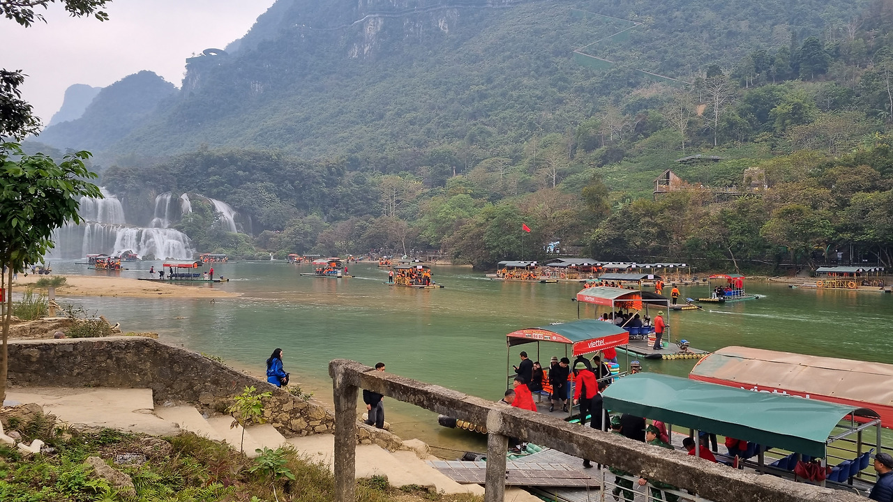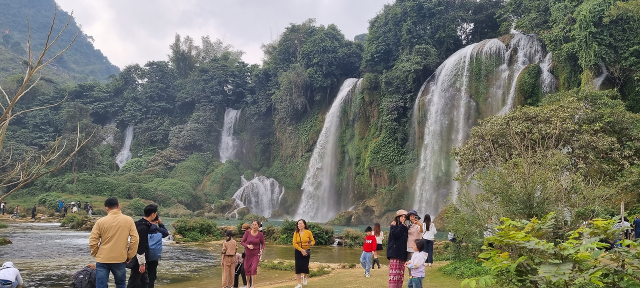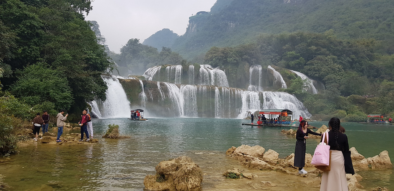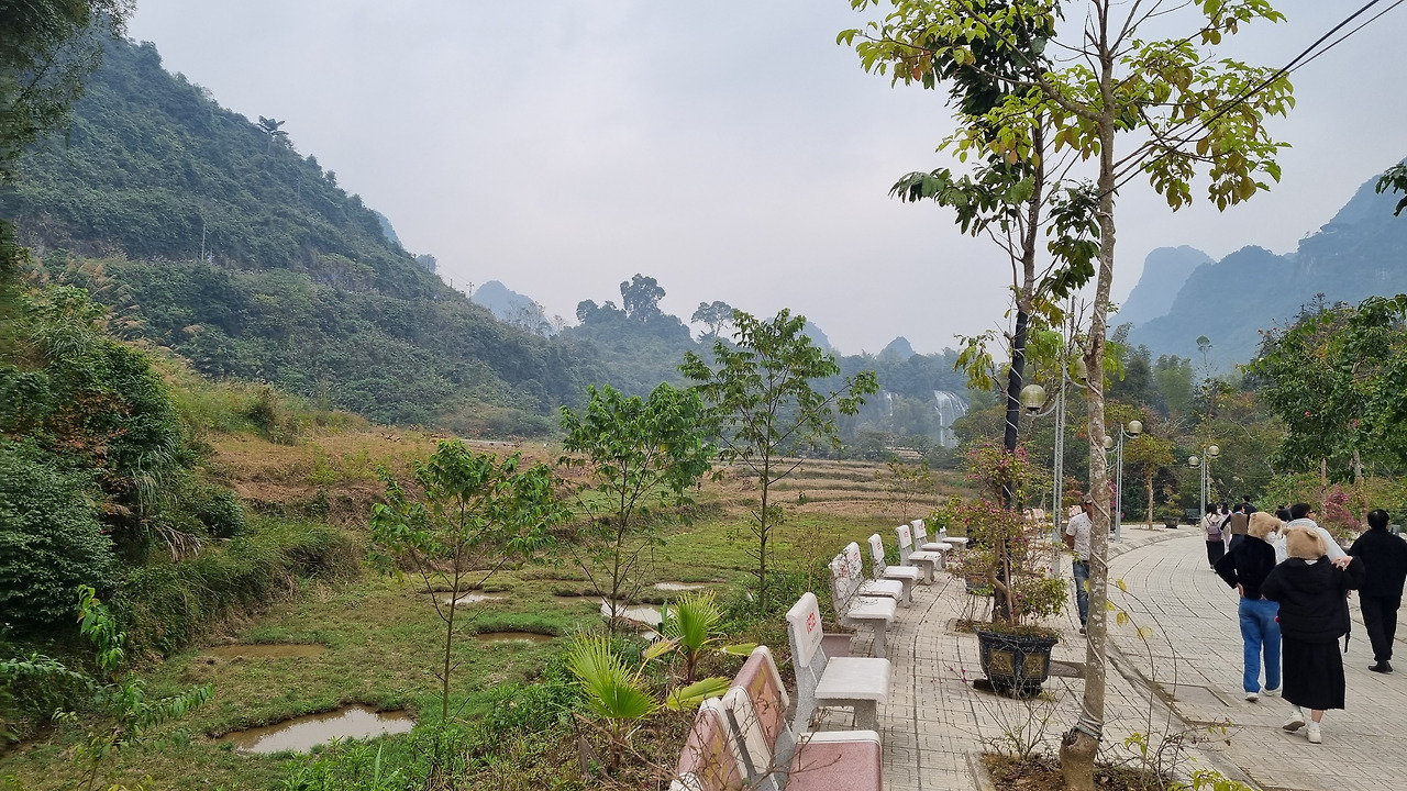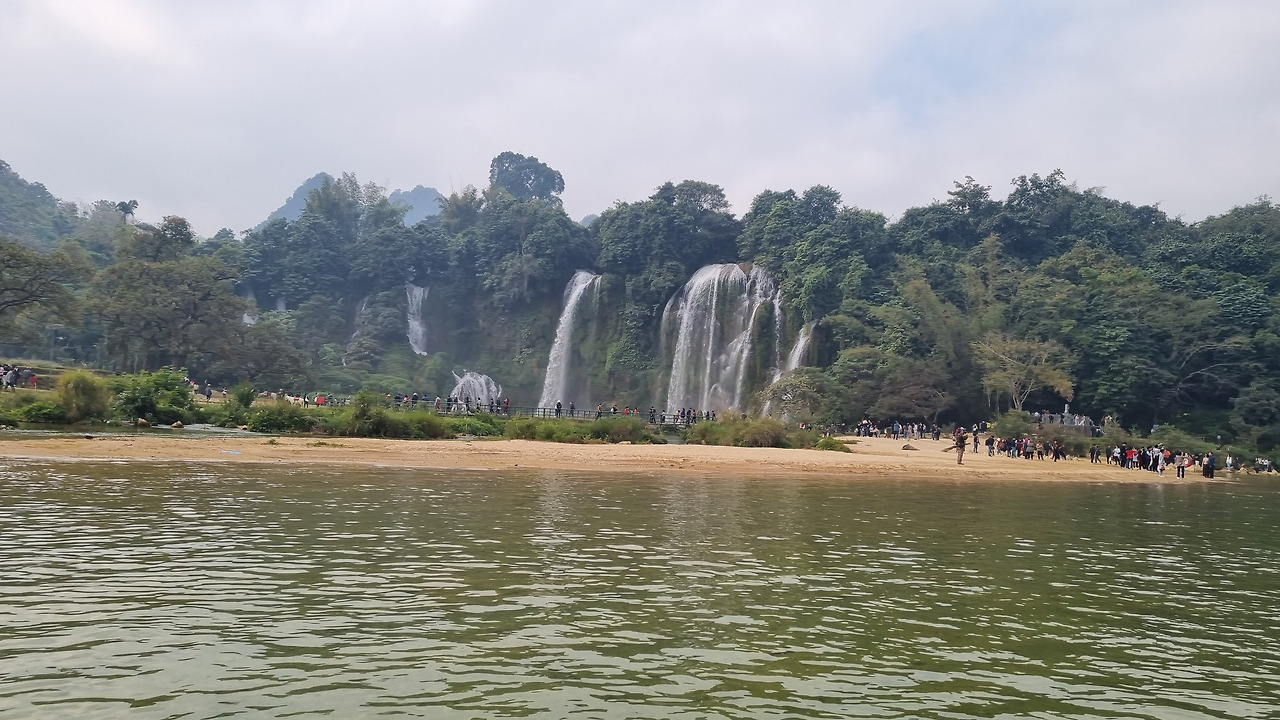 강 건너 쪽은 높은 산으로, 그곳은 중국 땅이다. 이곳 베트남 쪽에서는 평지를 통하여 쉽게 폭포에 접근할 수 있지만, 중국 쪽에서는 높은 산 위에 나있는 긴 잔도를 통해 힘겹게 폭포에 접근하여야 한다.
