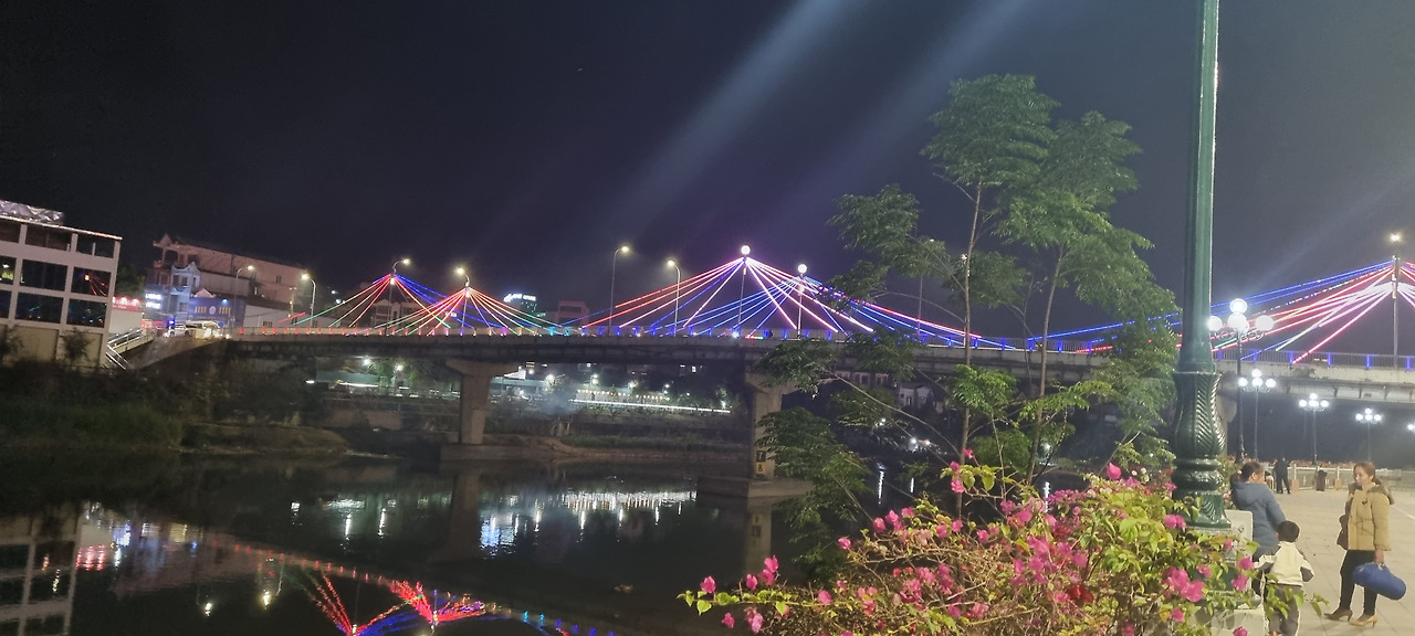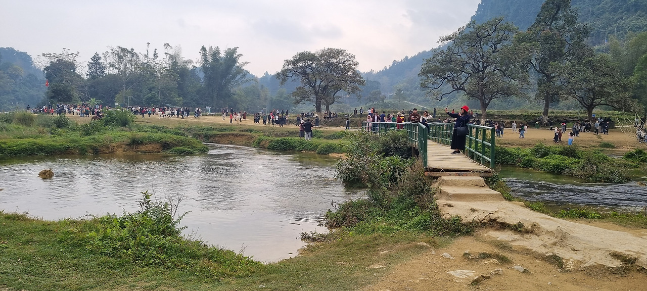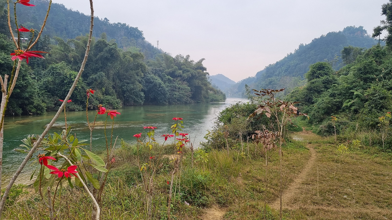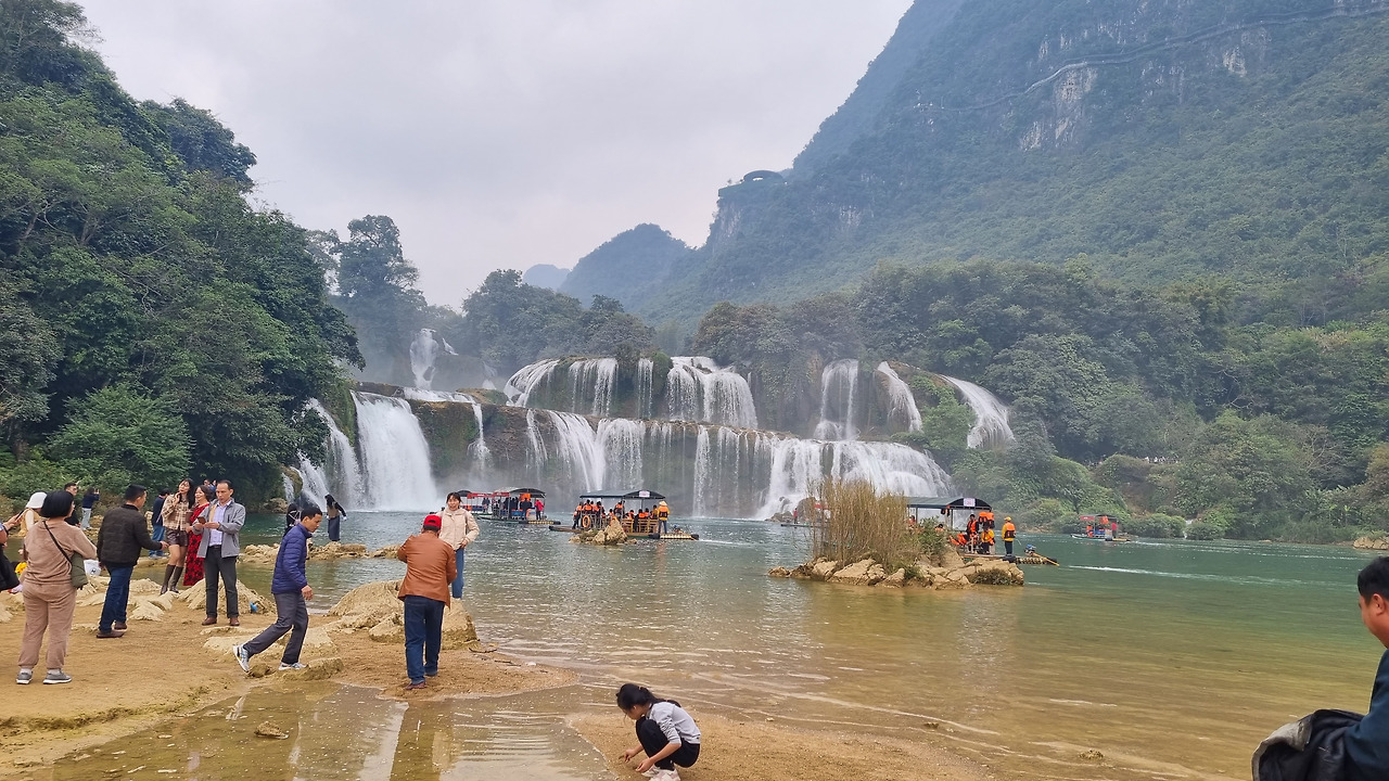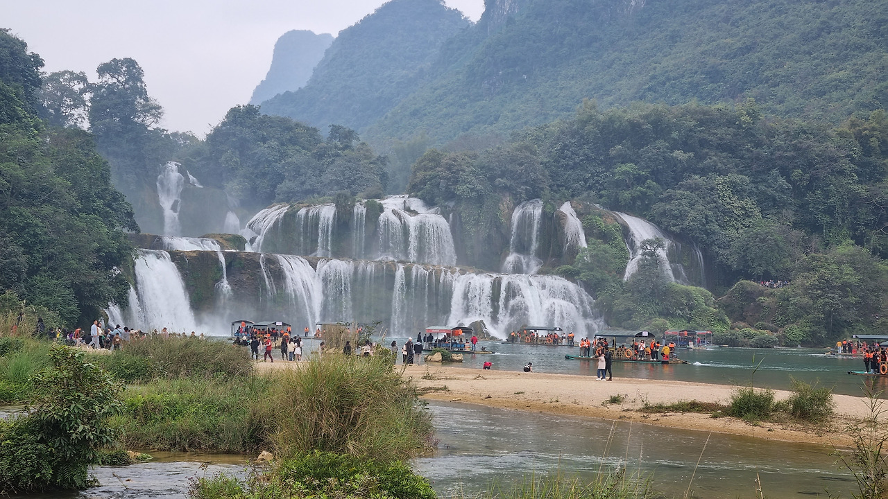 강 건너 쪽은 높은 산으로, 그곳은 중국 땅이다. 이곳 베트남 쪽에서는 평지를 통하여 쉽게 폭포에 접근할 수 있지만, 중국 쪽에서는 높은 산 위에 나있는 긴 잔도를 통해 힘겹게 폭포에 접근하여야 한다.