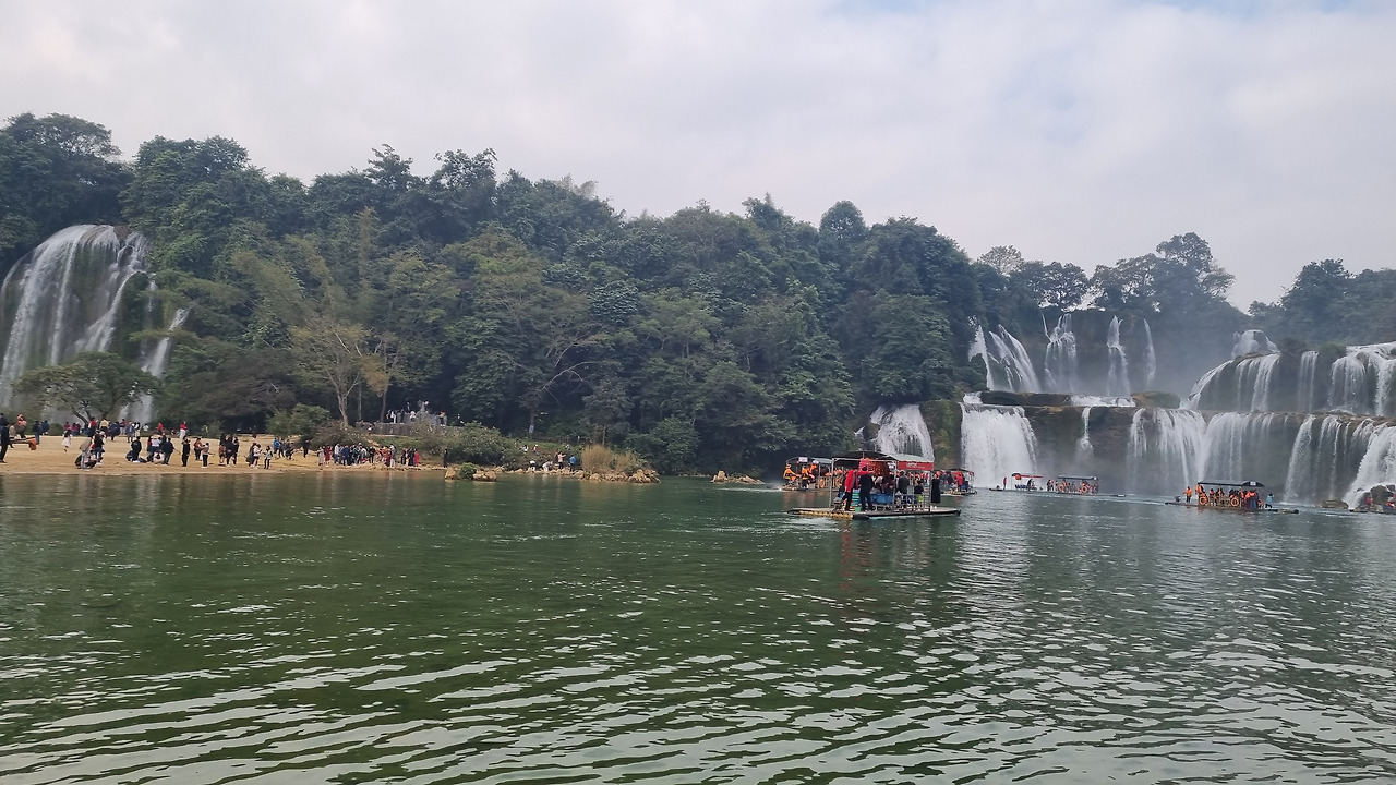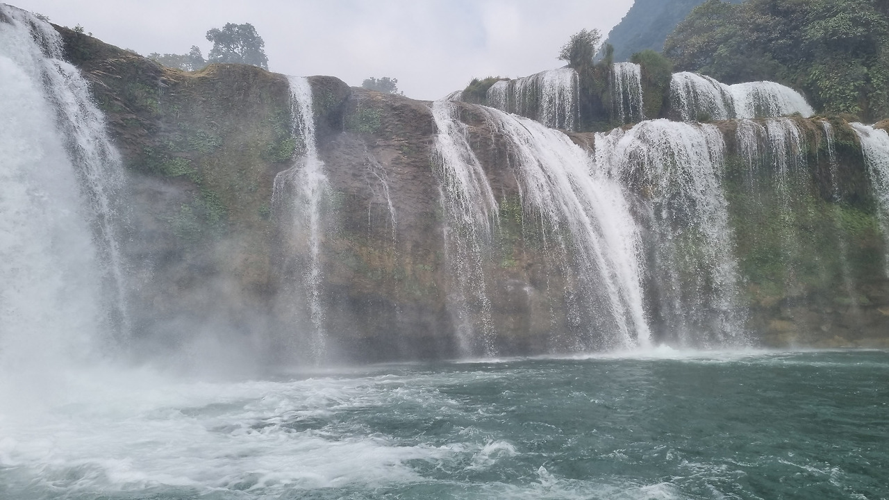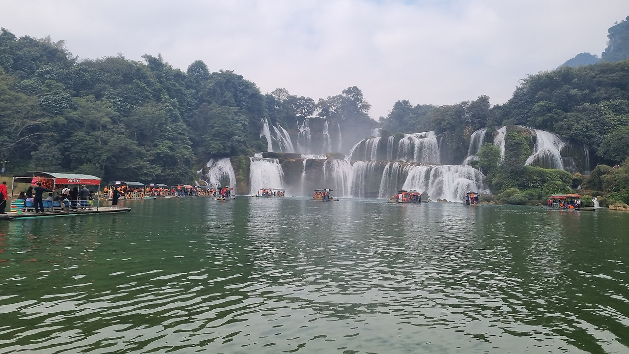 배를 타고 폭포 아래쪽까지 갈 수 있다. 강변 이쪽에서는 베트남의 유람선이, 강변 저쪽에서는 중국의 유람선이 출발한다. 강 가운데는 양국의 공동구역인 것 같다. 배를 탔다. 아주 넓고 평평한 배에 의자를 몇 줄 설치해 두고 있다. 사람들이 모두 앞쪽으로 몰려가 사진을 찍으려는 바람에 사진 찍는 찬스를 잡기도 쉽지 않다. 유람선은 폭포 물줄기 바로 근처까지 다가갔다가 큰 원을 그리면서 돌아 나온다.