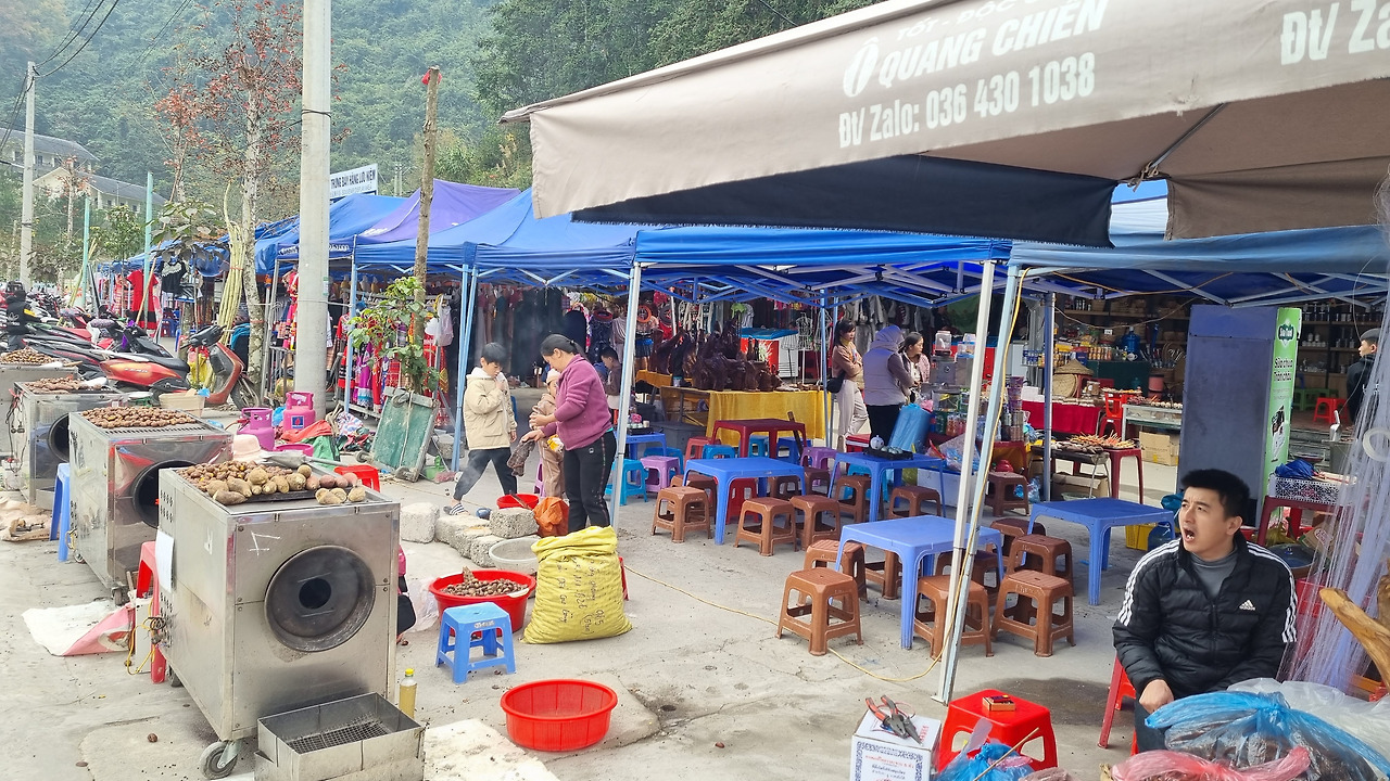 숙소로 돌아와 잠시 쉰 후 저녁을 먹으러 나왔다. 갑자기 술이 마시고 싶은 마음이 들어 지난번 박하에서 산 옥수수 술을 들고 나왔다. 이번 여행에서는 이상할 정도로 술을 마시고 싶다는 생각이 들지 않았다. 사파에서 맥주 한 캔, 동반에서 옥수수 술 두 잔 마신 것이 전부이다. 숙소 바로 옆의 전통시장으로 들어갔다. 음식점에는 짙은 갈색 기름으로 번들거리는 먹음직스러운 오리가 걸려있다. 술안주로 딱 어울린다는 생각이 들어오리 고기를 주문했다.
