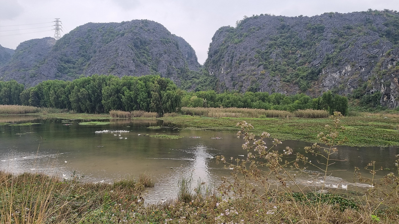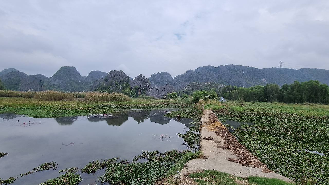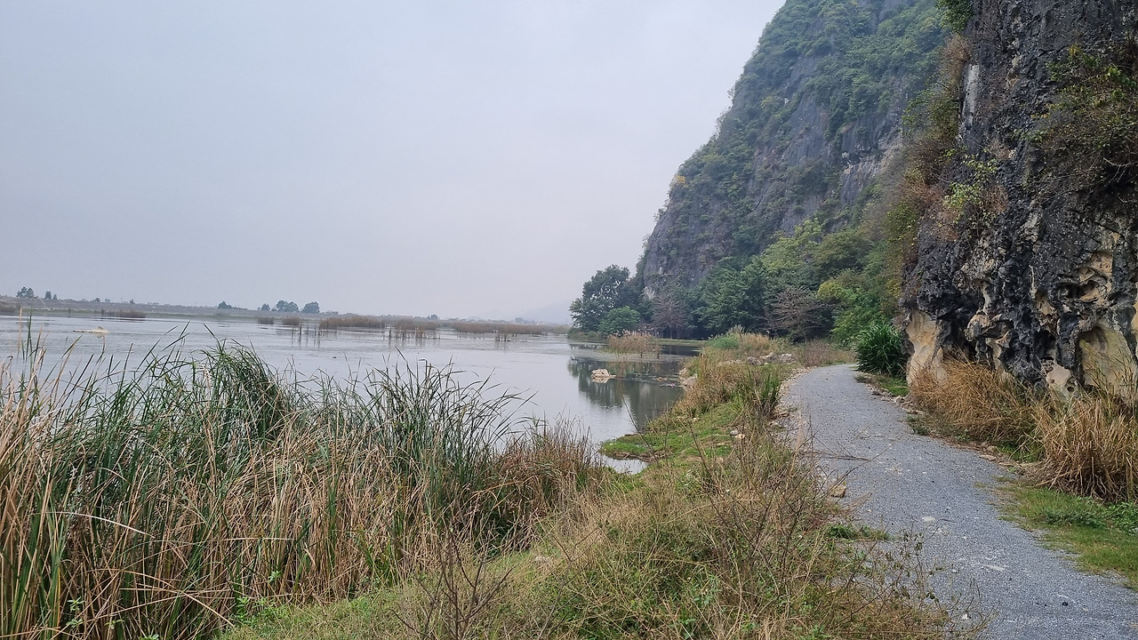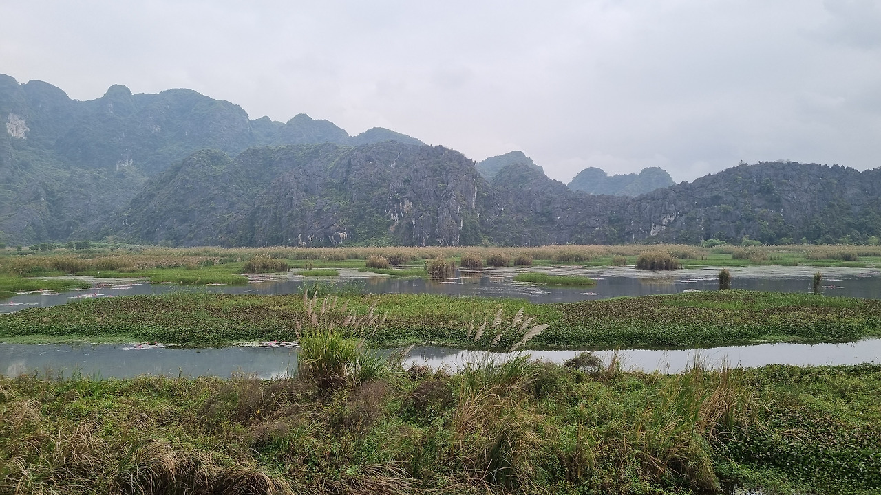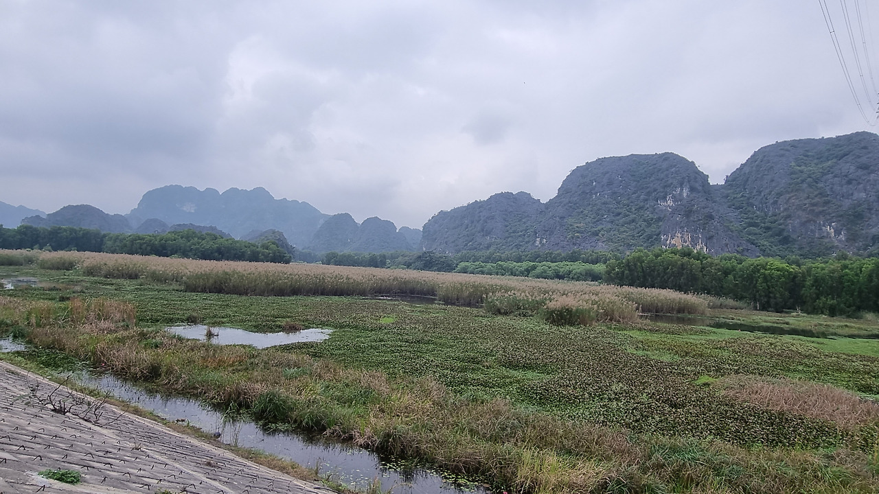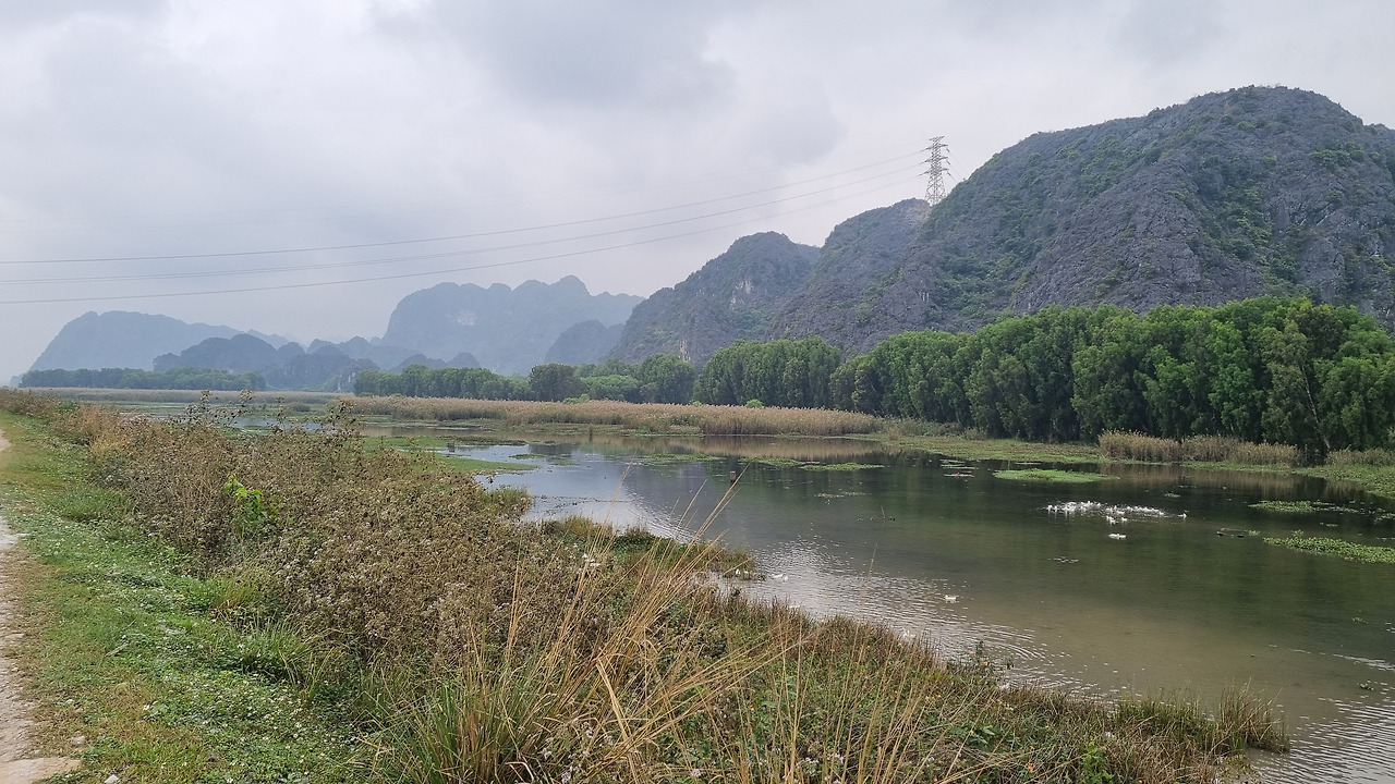 내비가 가리키는 대로 한 시간 남짓 달리니 제방길로 안내를 한다. 제방길로 올라서니 장관이 펼쳐진다. 제방길 건너편에 아름다운 산들이 줄지어 늘어서 있고, 제방길과 산 사이는 모두 습지이다. 보통 이곳 닌빈에는 습지가 논으로 되어있는 경우가 많은데 이곳은 인간의 손이 전혀 닿지 않은 자연 그대로의 습지이다. 습지는 산맥과 제방길 사이에 위치해 있다. 제방길은 산맥과 평행하여 나있으며, 그 사이에 습지가 아름답게 펼쳐져있다.