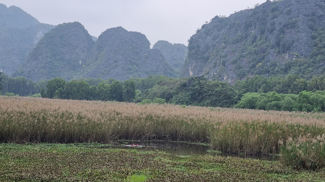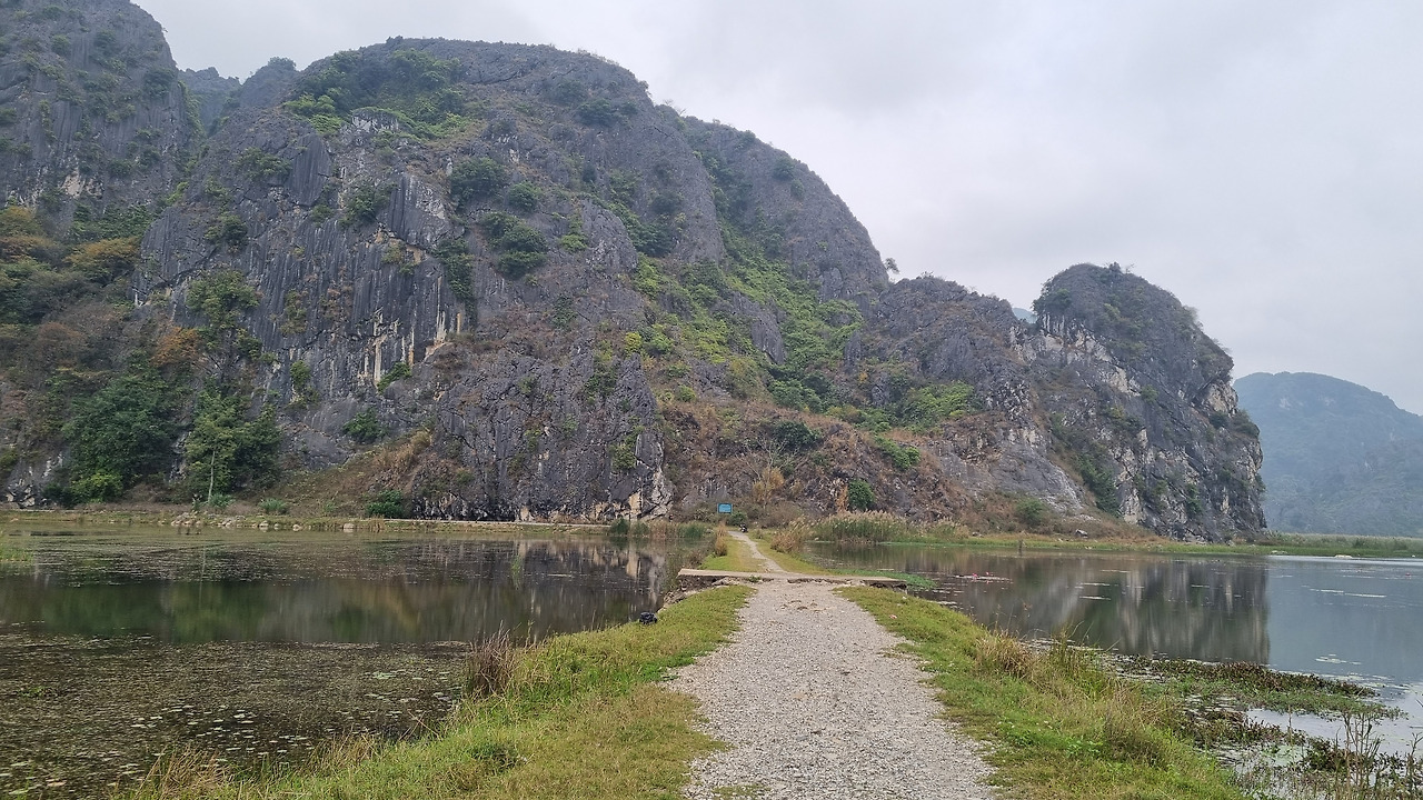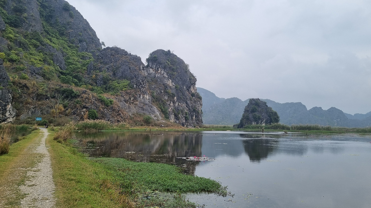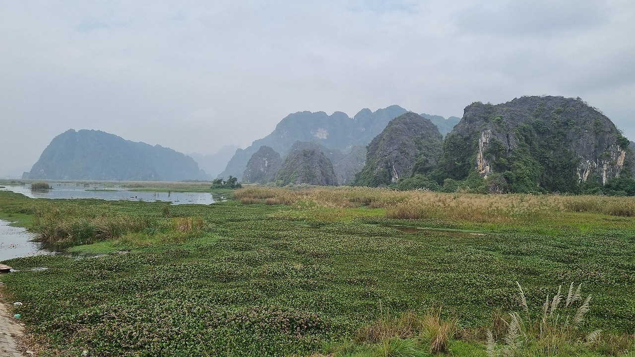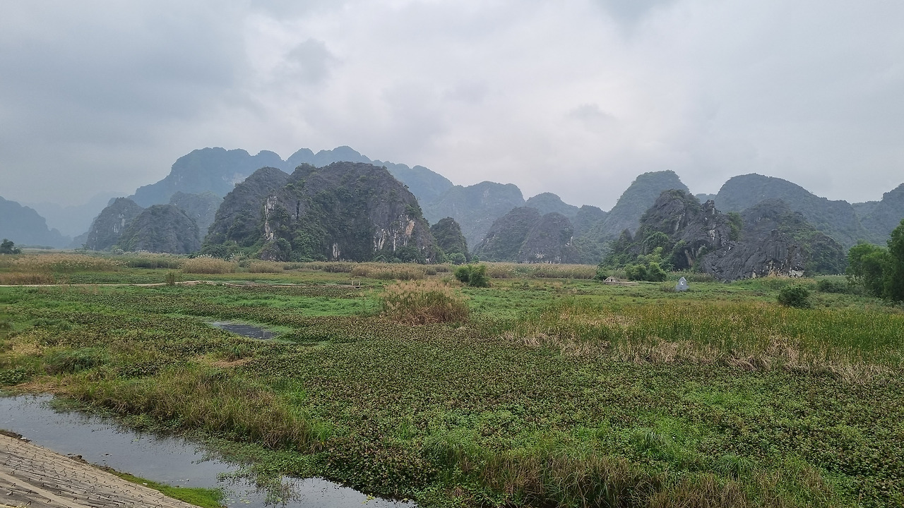 내비가 가리키는 대로 한 시간 남짓 달리니 제방길로 안내를 한다. 제방길로 올라서니 장관이 펼쳐진다. 제방길 건너편에 아름다운 산들이 줄지어 늘어서 있고, 제방길과 산 사이는 모두 습지이다. 보통 이곳 닌빈에는 습지가 논으로 되어있는 경우가 많은데 이곳은 인간의 손이 전혀 닿지 않은 자연 그대로의 습지이다. 습지는 산맥과 제방길 사이에 위치해 있다. 제방길은 산맥과 평행하여 나있으며, 그 사이에 습지가 아름답게 펼쳐져있다.