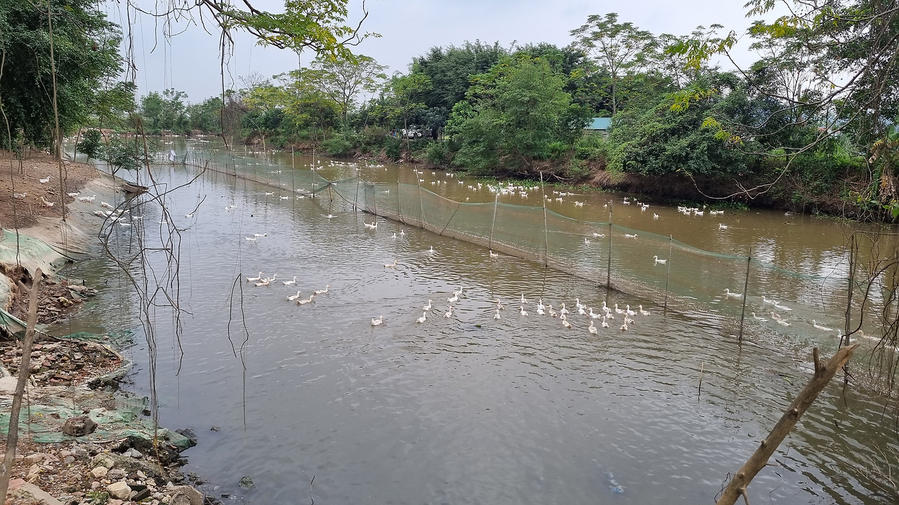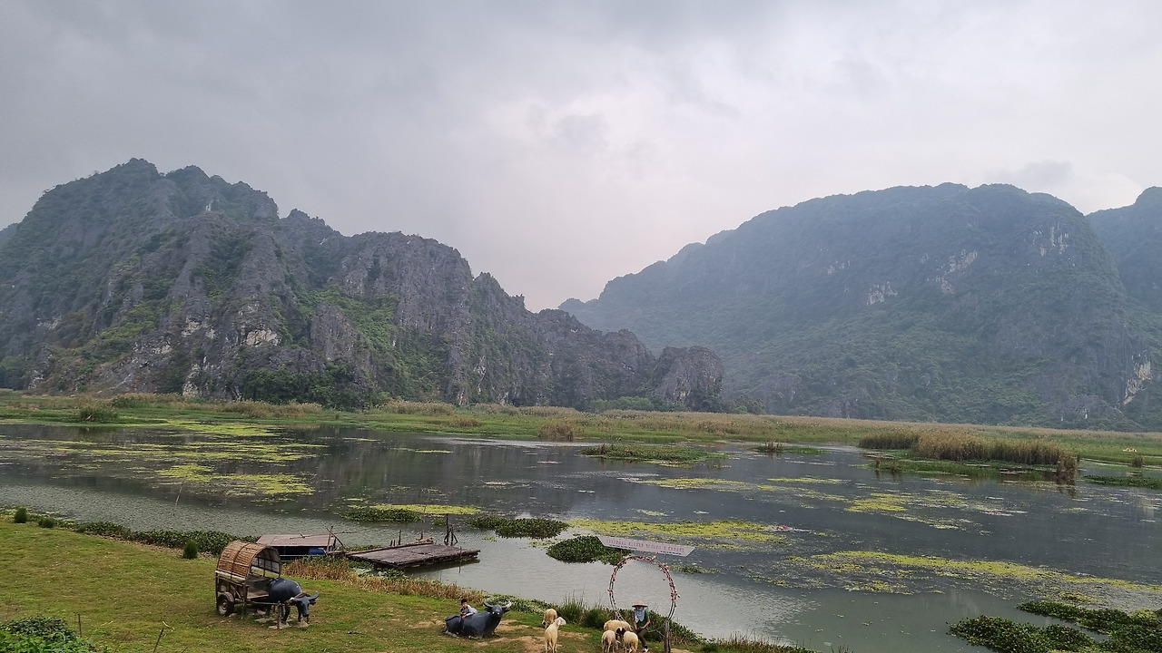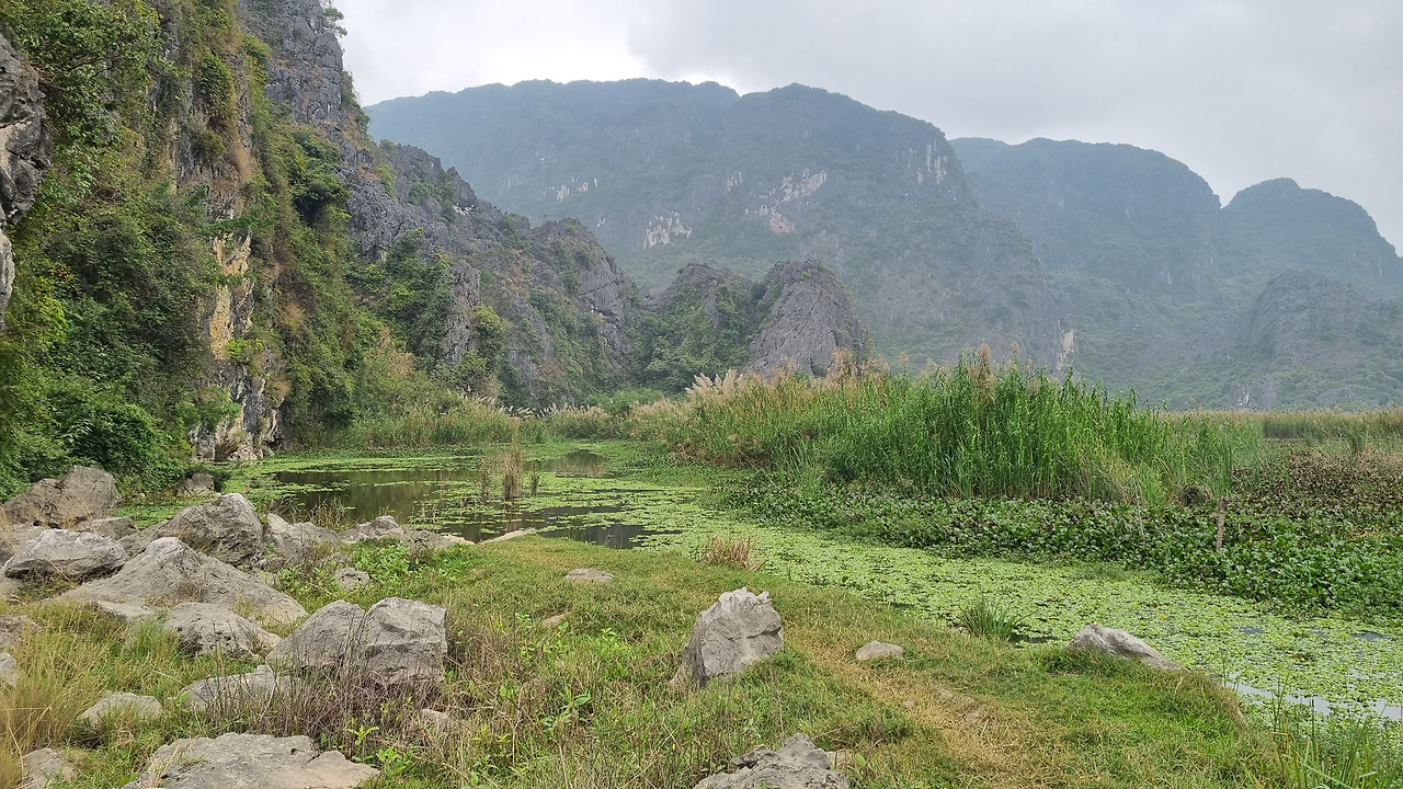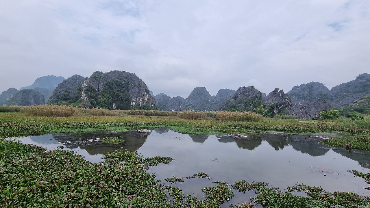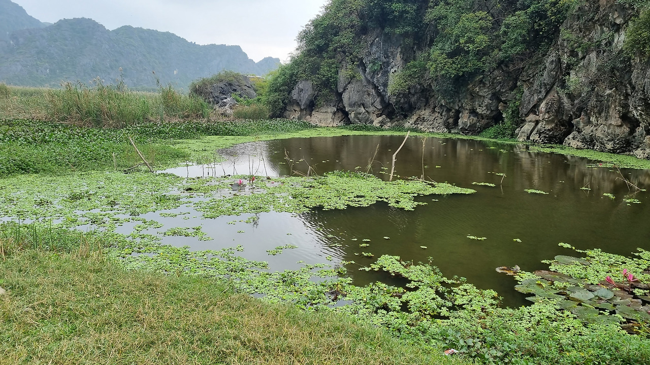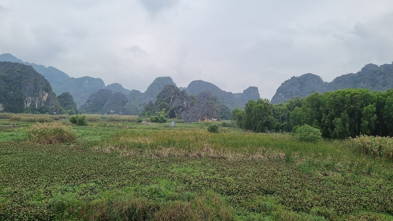 내비가 가리키는 대로 한 시간 남짓 달리니 제방길로 안내를 한다. 제방길로 올라서니 장관이 펼쳐진다. 제방길 건너편에 아름다운 산들이 줄지어 늘어서 있고, 제방길과 산 사이는 모두 습지이다. 보통 이곳 닌빈에는 습지가 논으로 되어있는 경우가 많은데 이곳은 인간의 손이 전혀 닿지 않은 자연 그대로의 습지이다. 습지는 산맥과 제방길 사이에 위치해 있다. 제방길은 산맥과 평행하여 나있으며, 그 사이에 습지가 아름답게 펼쳐져있다.