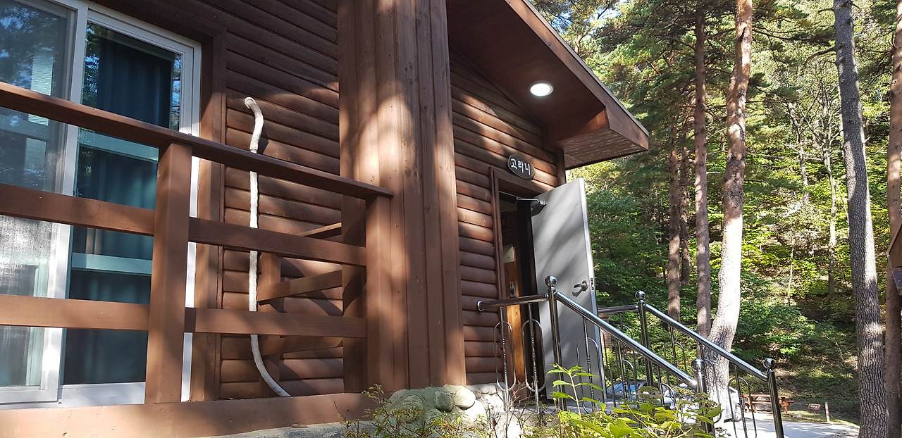 휴양림에 도착하니 8시가 가까워진다. 통나무집은 7인용으로 배정되었다. 경쟁률이 높아 몇 개를 지원했더니 이게 걸린 거다. 방 외에 따로 거실이 있어 방 1칸으로 된 2인용 통나무집에 비해 훨씬 낫다. 통나무집은 하늘을 찌를 듯 한 큰 소나무들 사이에 있다. 집 안에 들어서니 나무 냄새가 기분 좋다. 집 뒤는 계곡인 것 같다. 개울물 소리가 들린다.