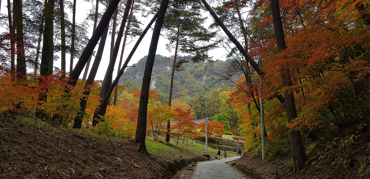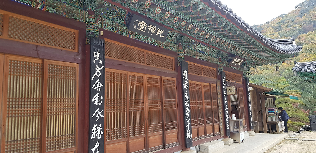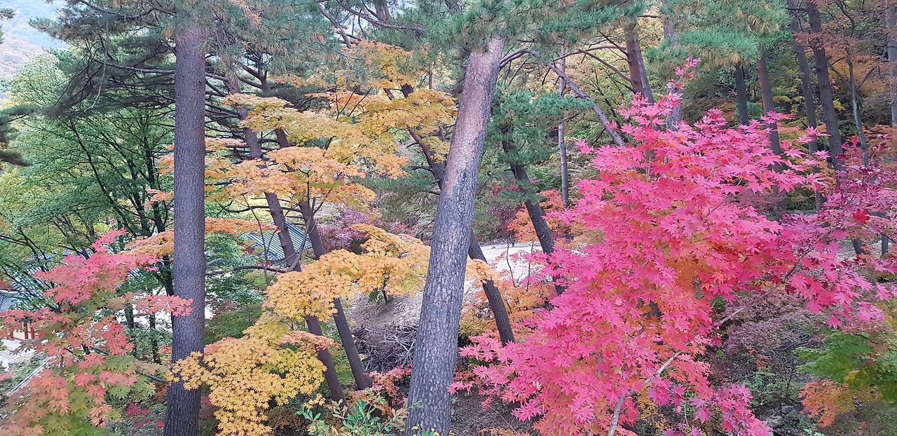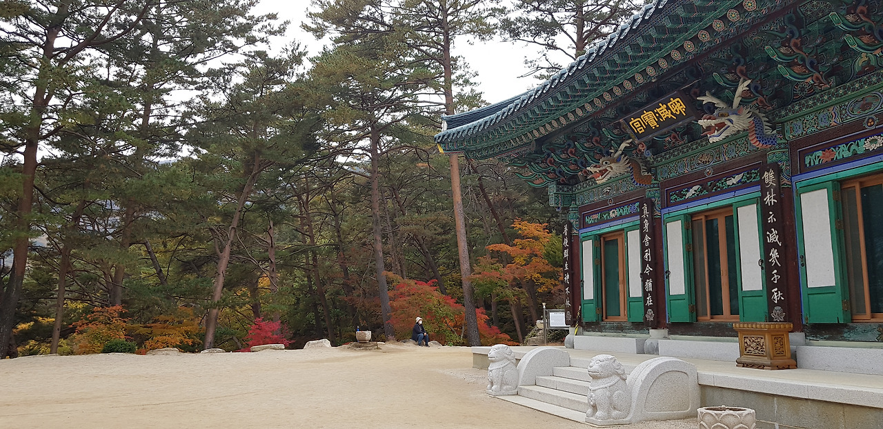 절 위쪽으로 적멸보궁으로 가는 길이 나온다. 키가 30미터는 되어 보이는 큰 소나무 숲 사이로 넓고 평탄한 길이 나있다. 소나무 아래에는 형형색색의 단풍나무도 섰여 있어 가을 단풍을 맘껏 뽐낸다. 며칠만 더 있으면 정말 황홀할 정도의 아름 다룬 단풍을 볼 수 있을 것 같다. 한참 걸어 올라가니 여러 채의 건물이 보인다. 적멸보궁인가 했더니 산신각(山神閣)이다. 산신각 옆으로 난 가파른 계단길을 걸어 올라가니 적멸보궁이 나온다. 적멸보궁 건물은 아주 최근에 지은 것 같은 새 건물이다.