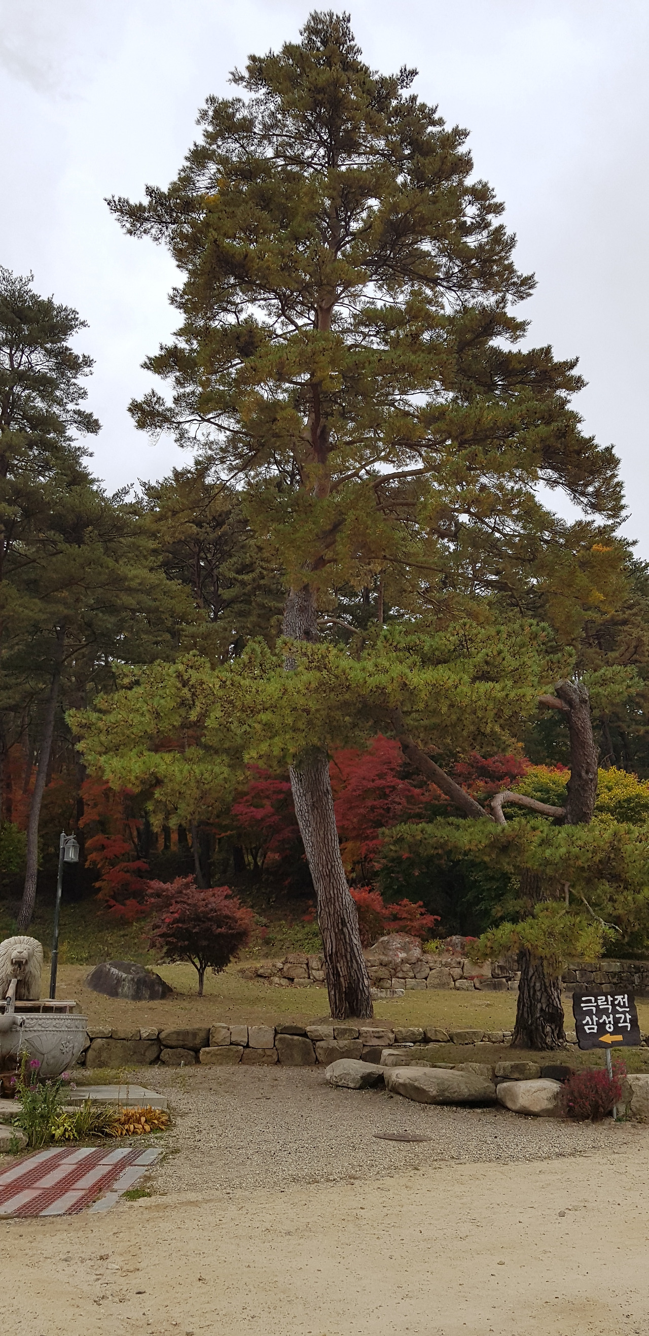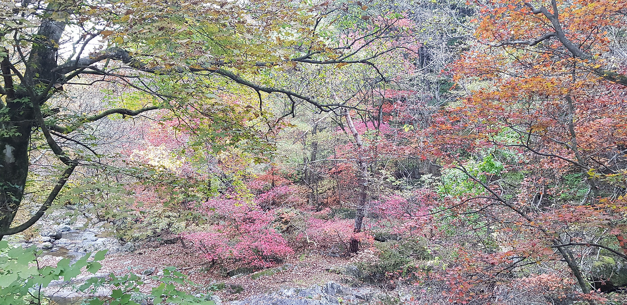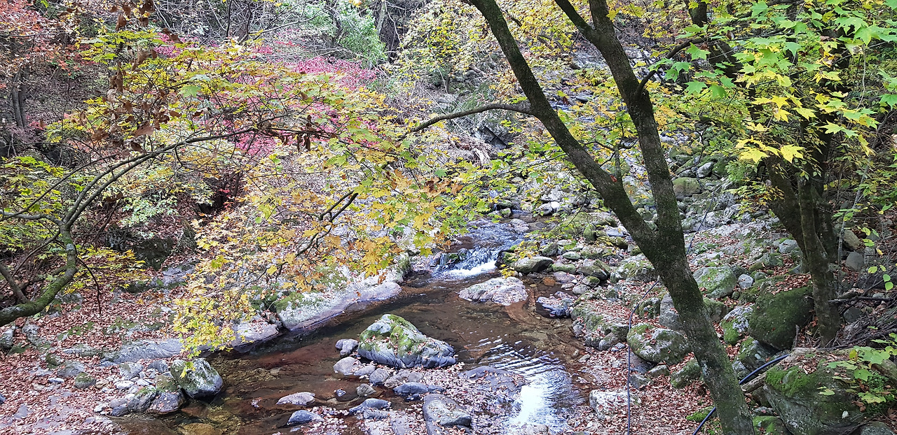 절 앞쪽 주차장을 지나서는 큰 솔밭이 있고, 까마득하게 키가 큰 잘 생긴 소나무들이 열을 지서 서있다. 잘 관리된 계획 조림된 국유림에서 가끔 좋은 소나무 숲을 발견할 수 있었는데, 여기 소나무 밭은 그 이상이다. 그러고 보니 솔밭은 법흥사가 내세우는 가장 큰 자랑거리 가운데 하나이다. 이번 여행은 단풍 구경이 큰 목적 가운데 하나였지만, 설악산이나 오대산에서도 아름다운 단풍을 그다지 보지 못하였다. 그런데 이곳 단풍은 이번 여행에서 본 단풍 가운데 가장 좋았다.