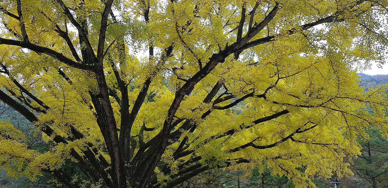 한참 올라가니 큰 주차장이 나온다. 더 위에도 주차장이 있는 것 같으나, 이미 차로 많이 올라왔으므로 여기서부터 걷기로 하였다. 주차를 하고 300미터쯤 걸으니 구룡사가 나온다. 구룡사 바로 앞도 큰 주차장이다. 다른 유명한 절들과 달리 이곳 구룡사는 절 안쪽에 큰 주차장을 마련한 것 같다. 구룡사 절 입구에 먼저 큰 은행나무가 나를 반긴다. 이번 여행에서 은행나무의 아름다움을 처음 실감하였다. 영월 관아의 은행나무, 오죽헌의 은행나무도 좋았고, 이곳 구룡사의 은행나무는 더욱 좋다. 그렇지만 은행나무라면 뭐니 뭐니 해도 영동에 있는 <영국사>의 은행나무를 따라올 것은 없다. 영국사(寧國寺) 은행나무는 정말 보는 것만으로도 감동 그 자체이다. <영국사> 은행나무에 대해서는 다음의 링크를 참고하기 바란다.