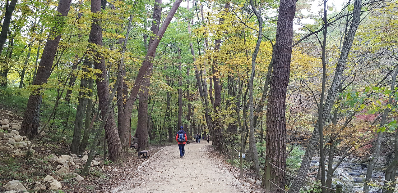 치악산 구룡사라 하면 항상 머리에 남아 있는 인상이 큰 나무와 시원한 그늘이다. 그리고 <은혜 갚은 까치> 이야기도 떠오르고.... 치악산 매표소 앞에 있는 주차장이 매우 좁다. 관광객이 별로 없는 것 같은데, 주차장이 좁다 보니 주차할 자리를 찾기 어렵다. 어쩔 수 없어 일단 차로 절까지 올라갈 수 있으면 올라가 보기로 하였다. 차로 매표소까지 올라가 입장권을 사면서 차를 타고 들어갈 수 있냐고 물으니, 의외로 선선이 차를 타고 올라가라 한다. 구룡사로 가는 넓은 산길을 따라 등산객들이 걸어 올라가는데 차를 타고 가려니 좀 미안했지만 어쩔 수 없다.