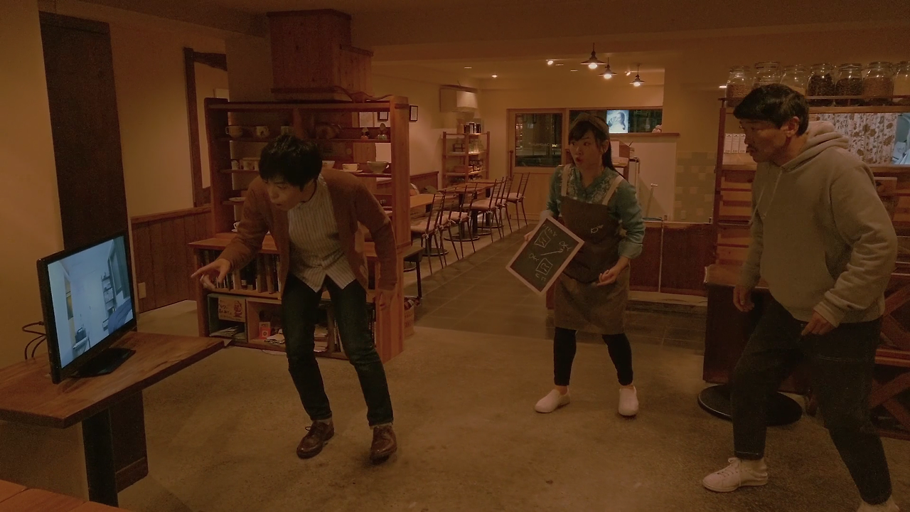 얼마 뒤 가토의 친구 몇몇이 밖의 쓰레기 통에서 1백만 엔이나 되는 거금을 주웠다고 기뻐하며 카페로 들어온다. 그들도 두 개의 마주 보이는 TV 속에서 자신들의 모습이 끝없이 겹치는 현상을 보고는 이상해한다. 얼마 후 그 친구들은 카페를 떠난다.