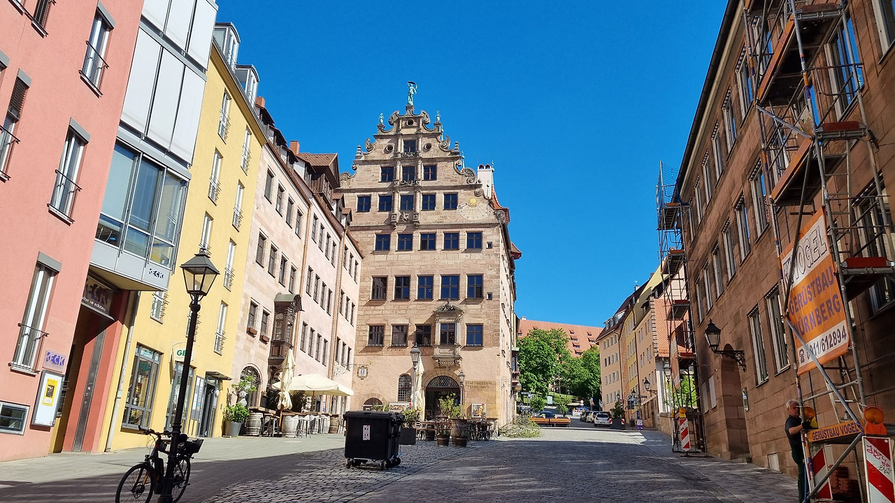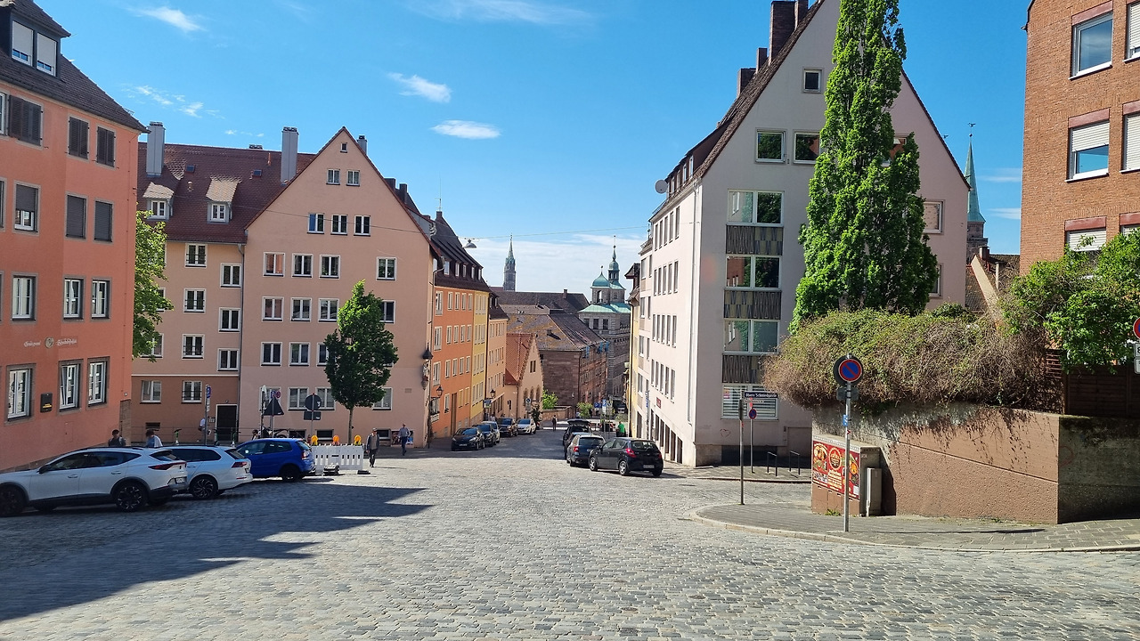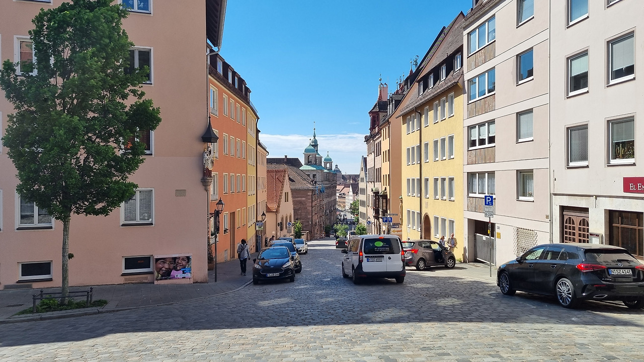 아름다운 분수를 지나 옆쪽 언덕길로 올라거면 뉘른베르크 성문과 성곽벽이 보인다. 성곽 쪽으로 올라가다 보면 왼쪽에 성 제발트 교회가 보인다. 13세기에 건립된 아름다운 성당이다. 그런데 이 성당은 좀 특이하게 길 쪽으로 본 건물이 있고, 교회의 상징물인 두 첨탑은 길과 반대쪽에 있다.